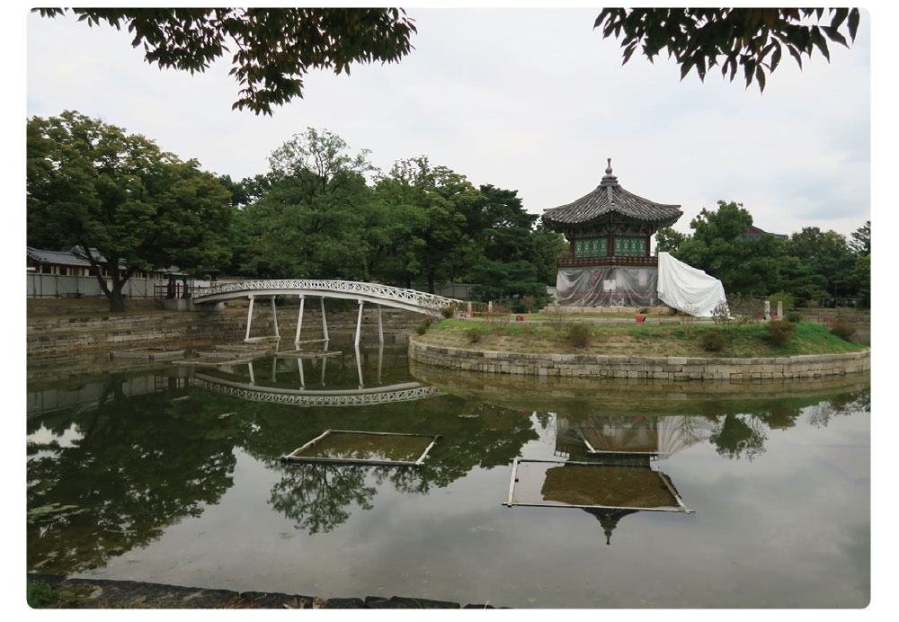 경복궁의 향원정(香遠亭)과 취향교(醉香橋)엔 최근 현저한 변화가 일어났다. 육모정자인 향원정은 초석이 침하되어 2017년 이래 4년여 간의 대대적인 해체수리 복원을 하고 모습을 정비했다. 이와 아울러 전쟁 후 연못의 남쪽으로 복원되었던 돌로 된 다릿발에 목재 난간을 갖춘 평교인 목교 취향교를 없애고 북쪽인 건청궁과의 사이에 아치형 나무다리를 세운 것이다. 향원정에 사용된 목재연륜연대 측정 등으로 1885년 건립추정의 근거도 확보하는 등 상당한 역사고증을 통해 이루어진 것엔 찬사를 보내나 항상 의문으로 남는 것은 ‘원형 보존’이다. 전쟁 후 남쪽으로 복원된 목교로 고증되었던 내용은 시대가 바뀌어서 간 곳이 없다. 이제는 그 목교는 영화로 남은 다리가 되어버렸다. <사진 9, 10>