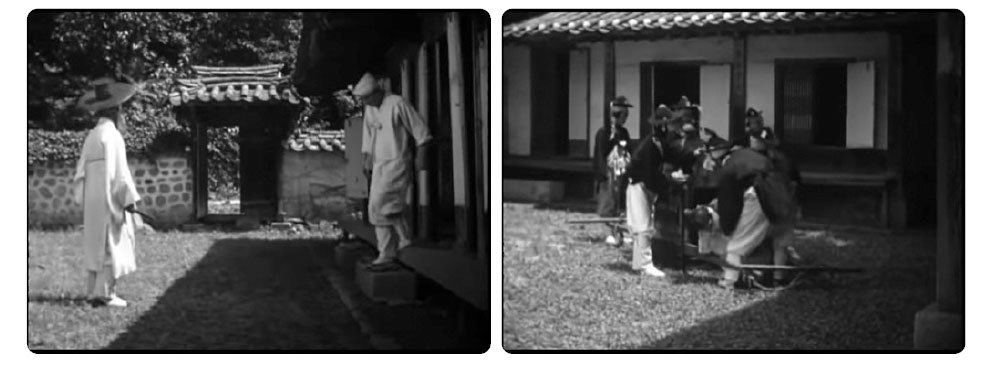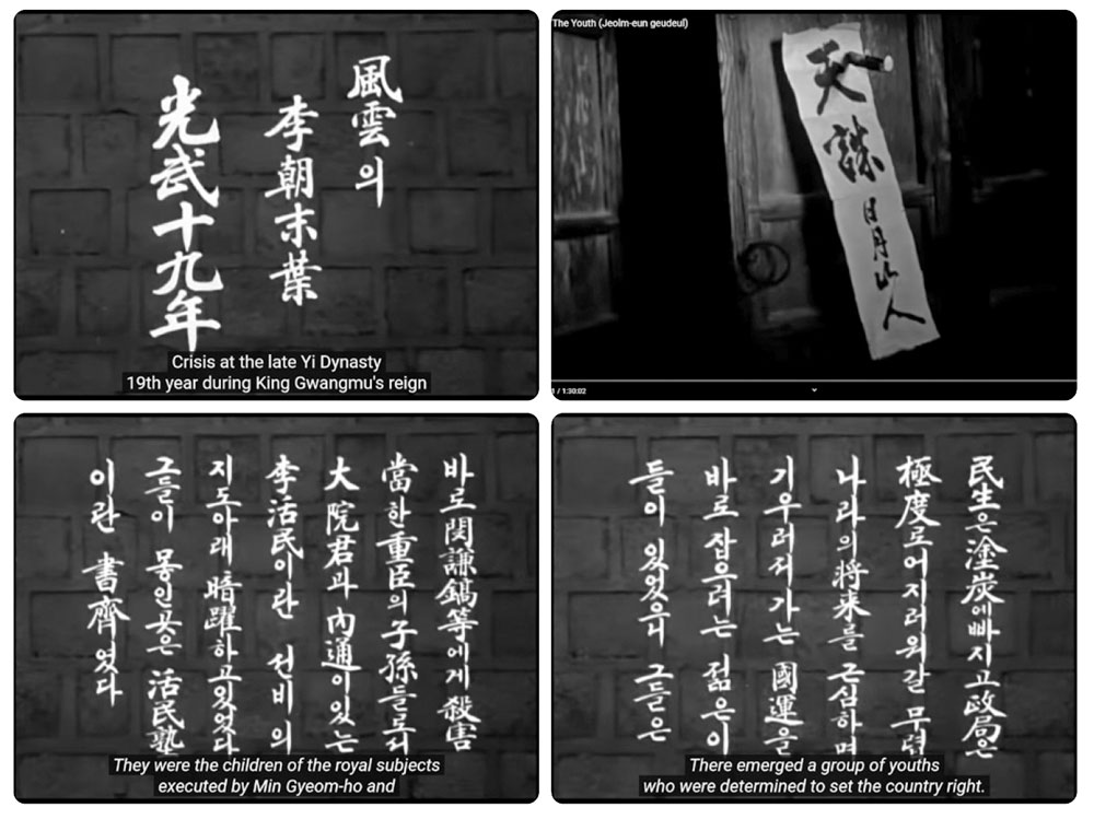영화가 시작되며 “풍운의 이조 말엽 광무(光武) 19년, 민생은 도탄에 빠지고 정국은 극도로 어지러워갈 무렵 나라의 장래를 근심하면서 기울어져 가는 국운을 바로잡으려는 젊은이들이 있었으니 바로 민겸호(閔謙鎬) 등에게 살해당한 중신(重臣)의 자손들로서 대원군과 내통이 있는 이활민이란 선비의 지도 아래 암약(暗躍)하고 있었다. 그들이 모인 곳은 활민숙(活民塾)이란 서재(書齋)였다”라고 서술하면서 ‘젊은 그들’의 의미를 암시한다.<사진 1>