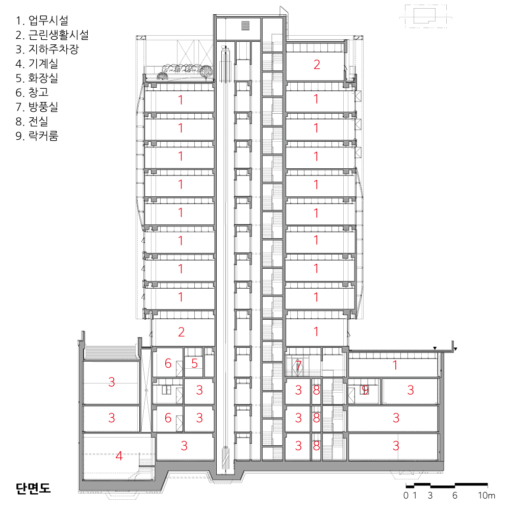 3) 실내 업무공간에서도 층별에 따라 변화하는 창호 오픈 형태에 의해서 채광, 환기, 조망뿐만 아니라 업무 공간환경의 다양성으로 이어진다.