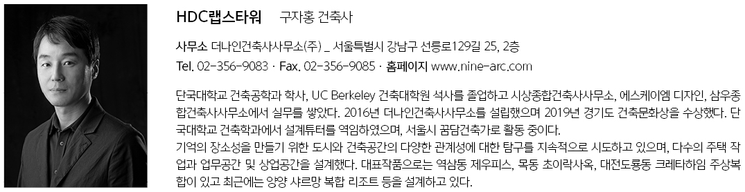 | HDC랩스타워 설계자 | 구자홍_더나인건축사사무소(주) 공동설계 | 이원재(미국건축사) _ 홍익대학교 교수 건축주 | 연암디벨로먼트(주) 감리자 | (주)일건IS건축사사무소 시공사 | 웰크론한텍 설계팀 | 손승현, 이지호, 김지혁 설계의도 구현 | 더나인건축사사무소(주) 대지위치 | 서울특별시 서초구 효령로 346 주요용도 | 업무시설 대지면적 | 1,385.70㎡ 건축면적 | 535.69㎡ 연면적 | 7,981.98㎡ 건폐율 | 38.66% 용적률 | 279.04% 규모 | 지하 4층 - 지상 10층 구조 | 철근콘크리트구조 외부마감재 | Sto Ventec 내부마감재 | 고흥석 버너구이, 다채무니도료 설계기간 | 2018. 09 - 2019. 07 공사기간 | 2020. 01 - 2021. 11 사진 | 신명현 영문감수 | Elina, Lee 전문기술협력 - 구조분야 : 성건엔지니어링(주) - 기계설비분야 : (주)태영이엠씨 - 전기분야 : (주)태영이엠씨 - 소방분야 : (주)태영이엠씨 |