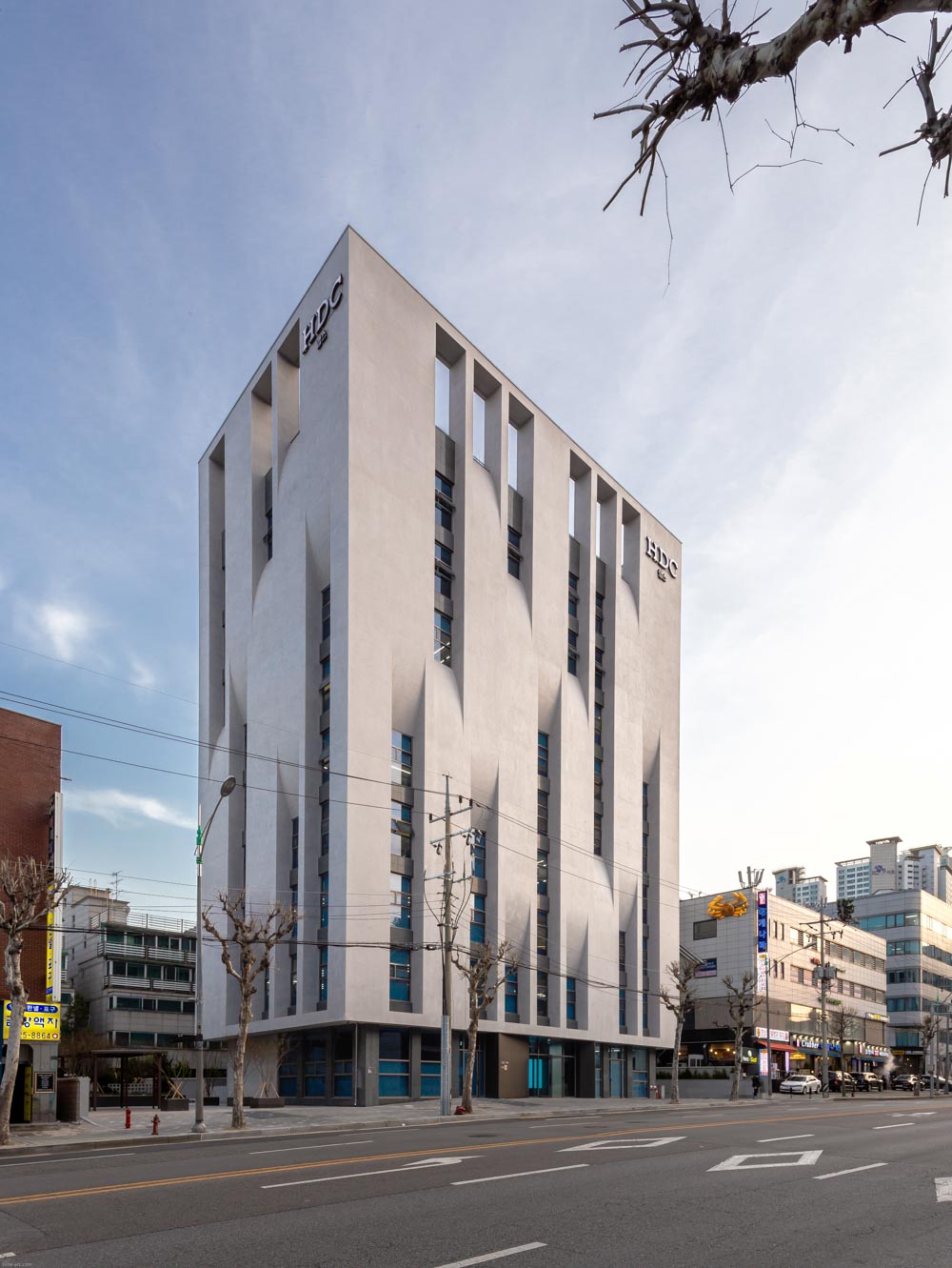 The curved facade in a zigzag shape starting from the low-rise horizontal space expresses the overall appearance of the building in various movements. This expresses the diversity of the urban landscape according to the location of the surrounding street space where the building is visible. In the indoor work space, the shape of the window that changes depending on the floor leads to the diversity of the work environment that includes lighting, ventilation, and view.