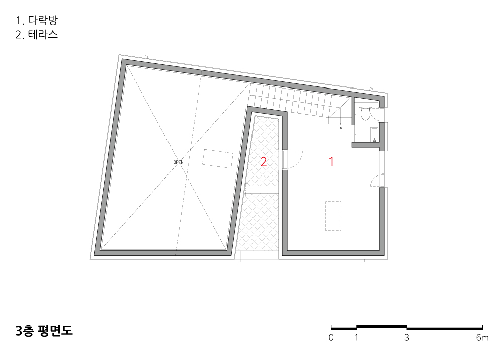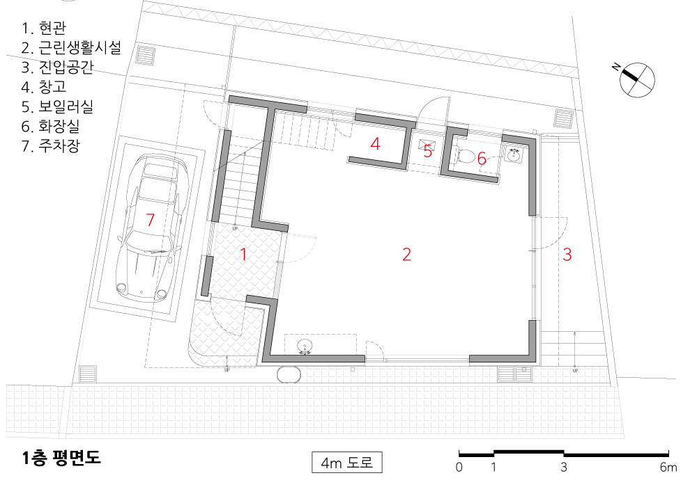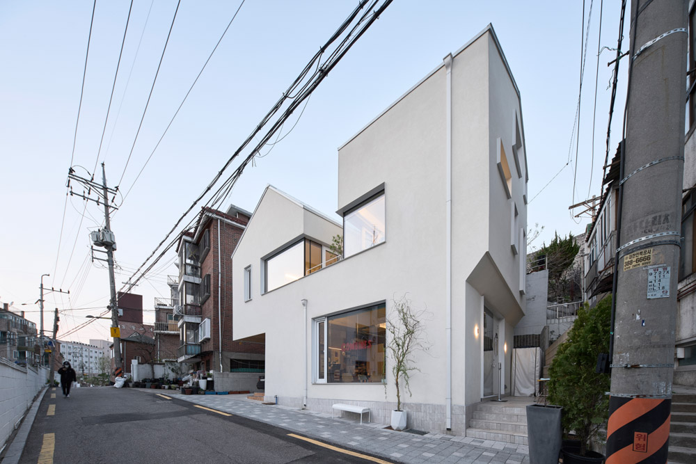 일상이 이루어지는 공간과 일을 하는 공간을 하나의 건축에 담는다. 일상과 작업의 동선을 분리하면서도 필요에 따라 연결되게 하는 것이 중요했다. 1층은 작업의 공간이며, 건물과 동네가 만나는 장소였다. 길에서 바로 진입하지 않고 앞쪽의 작은 마당을 통해 진입하는 것은 개방성과 개인을 동시에 만족시키기 위해서였다.