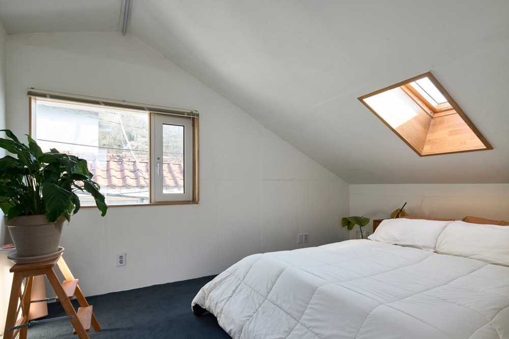 1년에 한번 올까 말까 하는 친구들을 위해 게스트룸을 만들 필요는 없다는 건축주의 생각은 확고했다. 방으로 나눌 필요가 없어지니 많은 벽들이 사라졌다. 방에는 벽지를 반드시 사용해야 한다는 고정관념을 벗어나니 거푸집을 떼어낸 벽에 페인트도장도 좋았다. 코너창의 프레임을 없애니 더 넓고 시원한 풍경이 눈에 들어온다. 음식을 자주 하지도 않는데 커다란 주방은 필요가 없었다. 딱 필요한 만큼의 간결한 주방이 들어왔다. 평수, 방의 개수, 남들이 다하는 마감에 대한 생각을 버리니 오롯이 부부만을 위한 공간이 찾아왔다. 부부를 위한 세상에 단 하나뿐인 집이다.