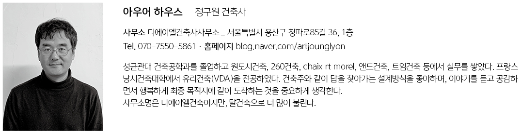 When I, the architect, was pondering about designing a house, I met a couple full of personality who decided to build a house in Hongje-dong by coincidence and creating the most comfortable space for them was the beginning of this project. After hearing the design fee from the first architect, they gave up building the house, but met my firm through an acquaintance and started building a house again. The client made a list of things that are really needed: High ceilings, open space, corner windows, courtyards, skylights! Realizing each and every one of the spaces where these elements mingled was a difficult but very enjoyable task.