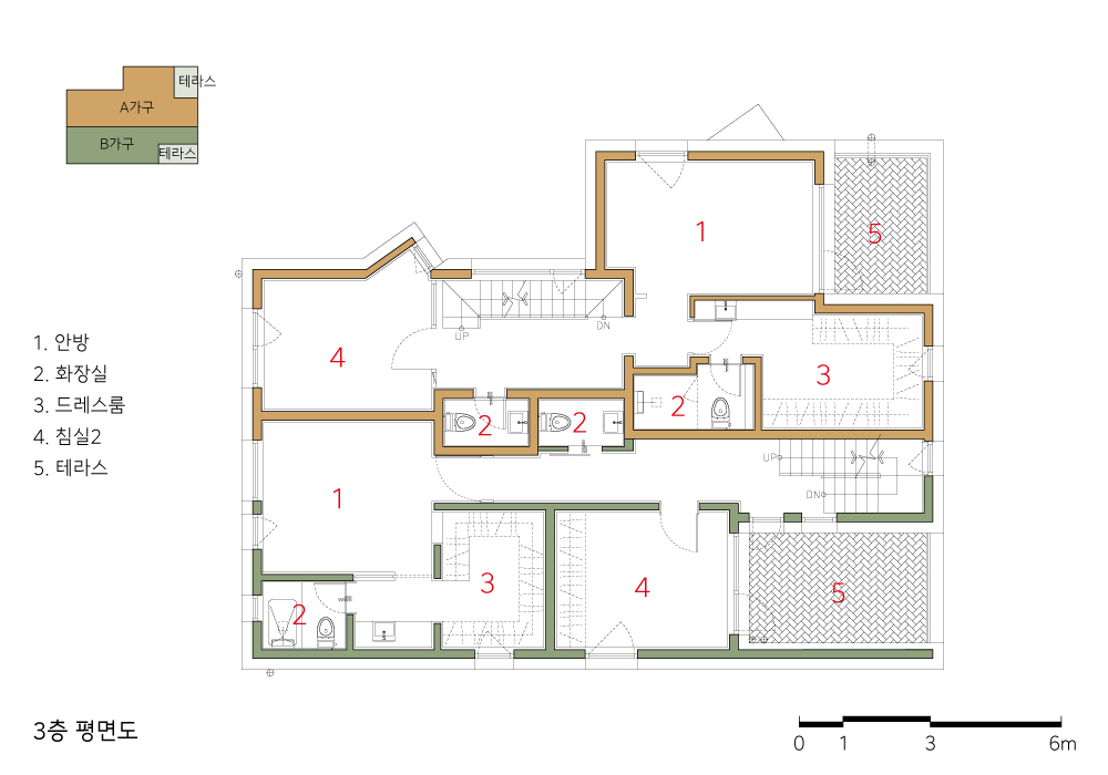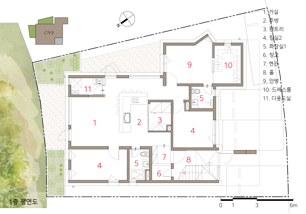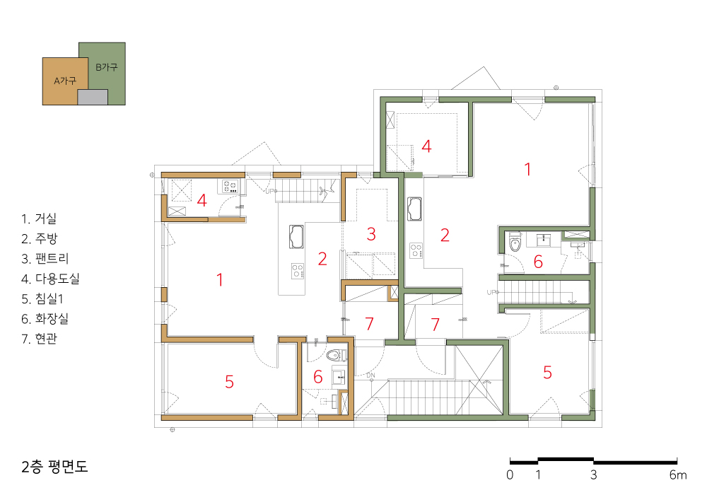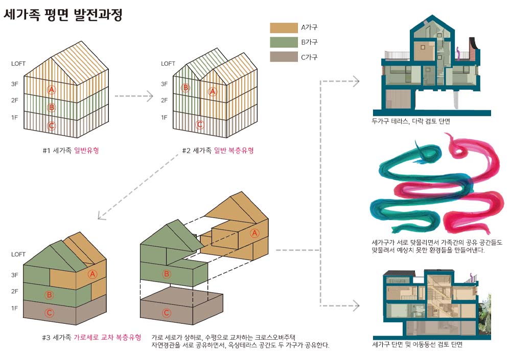 한 세대가 한 개 층씩 생활하는 것이 일반적인 다가구주택의 형태와 생활 유형이나, 그렇게 해서는 건축주의 의뢰 조건들이 충족되지 않았다. 앞쪽은 볕이 좋은 남향이고, 뒤쪽은 북향이며 앞에 공원이 있는 조건 아래, 건축주의 요청에 따라 전 세대가 남향 볕을 받으면서 공원을 볼 수 있는 크로스오버 주택이 완성됐다. 건축주의 부모님을 위한 세대는 연세를 고려하여 1층에 배치됐으며, 도로 쪽으로부터는 다소 막혀있고, 일부 남향 볕을 받을 수 있으면서 1층 작은 정원 2개와 북향의 공원을 바로 면한다. 이제 두 세대는 2층, 3층, 다락의 복층 세대를 구성하되 2층에서 동서를, 3층에서 남북을 나눠 가진다.