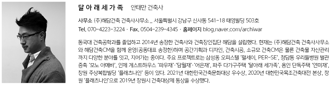 | 달 아 래 세 가 족 집 설계자 | 안태만 · 송정한_(주)해담건축 건축사사무소 건축주 | 임채빈, 김보람 시공사 | 해담건축CM 설계팀 | 도영규 대지위치 | 경기도 파주시 교하로133번길 주요용도 | 다가구주택 대지면적 | 269.50㎡ 건축면적 | 154.93㎡ 연면적 | 305.45㎡ 건폐율 | 57.49% 용적률 | 113.34% 규모 | 3층 구조 | 철근콘크리트구조 외부마감재 | 표면 커팅 벽돌 내부마감재 | 실크벽지, 자작나무 합판 설계기간 | 2019. 12 – 2020. 03 공사기간 | 2020. 03 – 2020. 11 사진 | 최진보 전문기술협력 - 구조분야 : 정성욱 _ (주)에스큐브이엔지 - 기계설비분야 : (주)선인기술단 - 전기분야 : (주)선인기술단 |