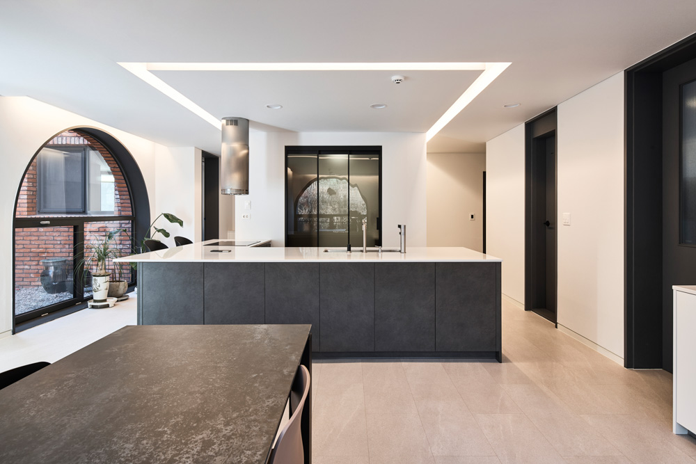 이전에 없었던 개념의 3층 주택이라 배관의 이동 경로, 골조의 배치, 전기 콘센트의 위치 등을 시공 당시 일일이 현장팀에 알려줘야 했다. 3층에서 두 세대 각자 남향으로 면한 커다란 외부 테라스도 가져갈 수 있었다. 1층의 아치창의 디자인과 카페처럼 구성된 거실은 가족애가 많은 건축주의 부모님을 위한 배려다.