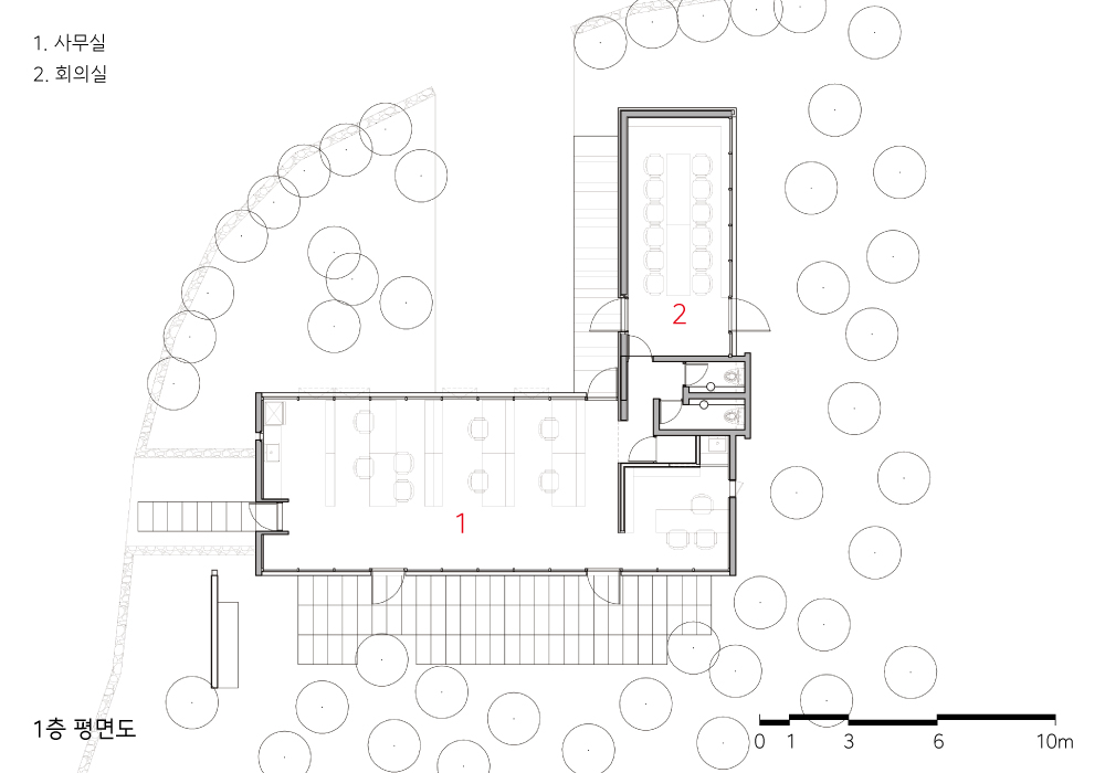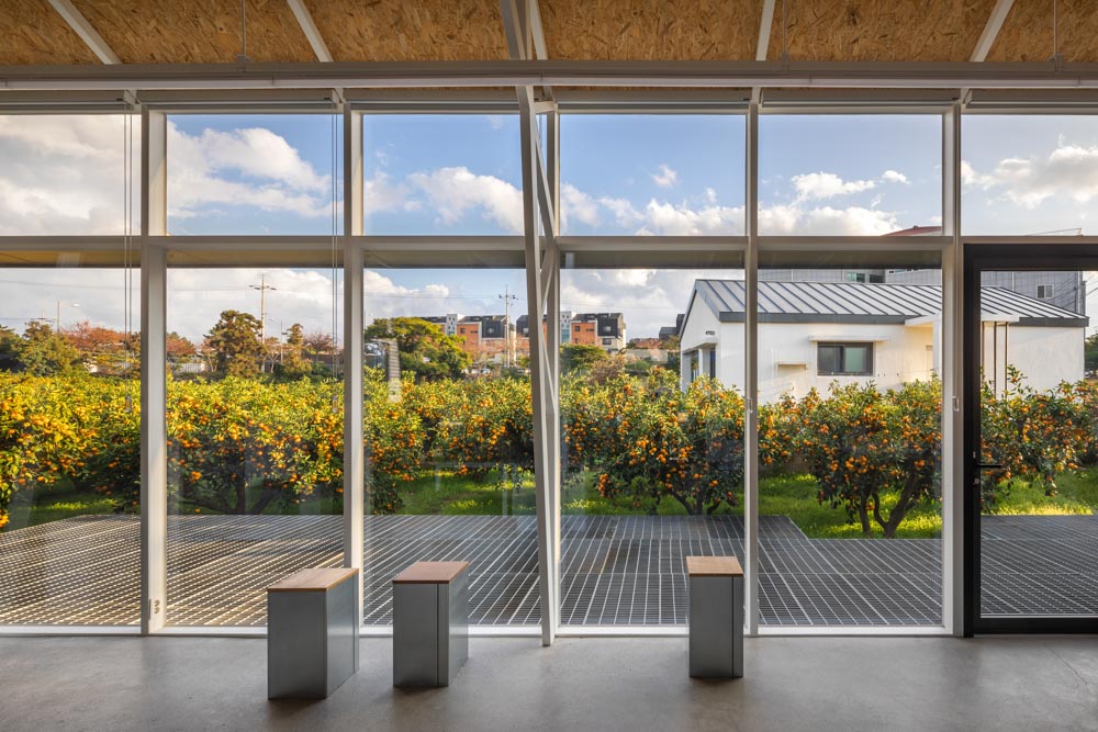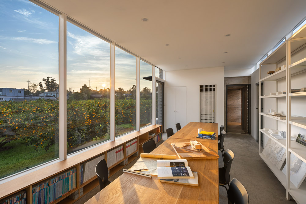 The main objective of this project was to harmonize a landscape and a workplace by introducing the tangerine orchards as much as possible without compromising the office function. The north and south of the office has abundant daylight and view with full glass, while the east and west has concrete wall to maintain the structure and control the harsh western light. In addition, the conference space was made to have glass in the east to look at the panoramic view of the orchard, and a wall was made in the west to respond to the light.