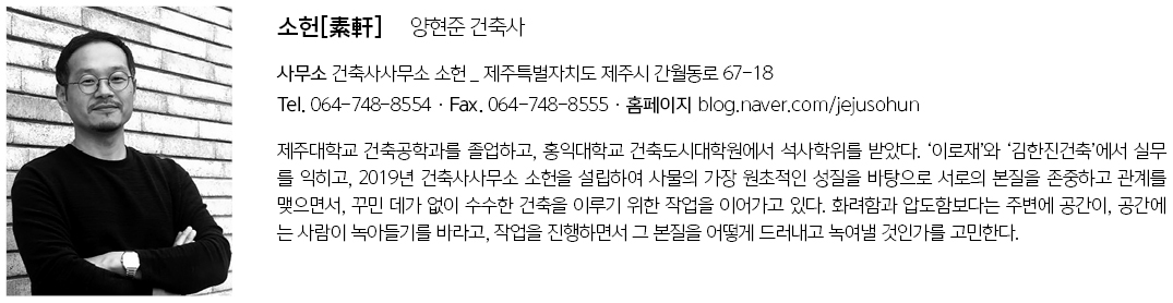 | 소헌[素軒] 설계자 | 양현준_건축사사무소 소헌 건축주 | 양현준 시공사 | 지에이유아키팩토리 설계팀 | 김이선 대지위치 | 제주특별자치도 제주시 간월동로 67-18 주요용도 | 근린생활시설 대지면적 | 345.00㎡ 건축면적 | 131.37㎡ 연면적 | 130.51㎡ 건폐율 | 38.08% 용적률 | 37.83% 규모 | 1층 구조 | 경량철골구조 외부마감재 | 노출콘크리트, 복층유리 내부마감재 | OSB합판 설계기간 | 2019. 07 – 2019. 10 공사기간 | 2019. 12 – 2020. 09 사진 | 윤준환 |