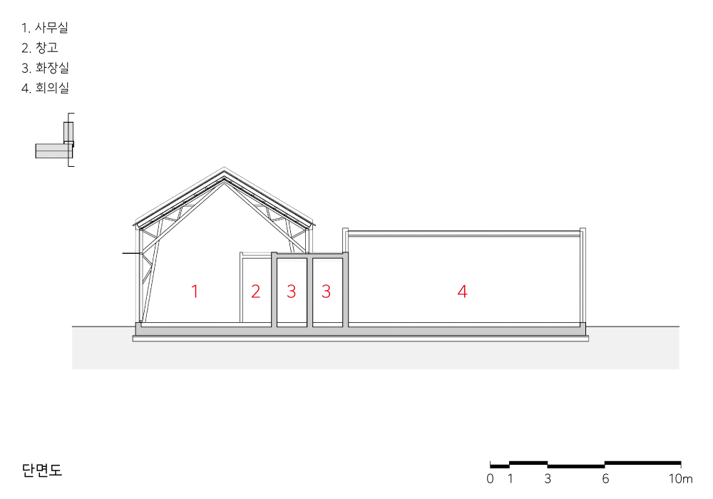 사무실의 기능을 중요시하면서도 과수원 창고처럼 사무실이 주변과 조화롭게 과수원 풍경의 일부가 되도록 형태와 재료를 선택했다. 소헌은 크게 두 개의 공간으로 이루어진다. 탕비와 화장실을 포함한 사무공간과 과수원의 풍경을 담아낸 회의공간이다.