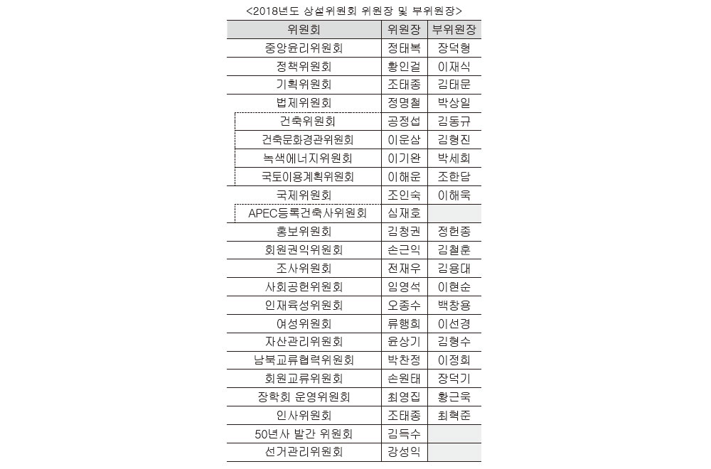 올해는 ‘위원회 부위원장제’를 도입해 각 위원회 당 부위원장 1인을 선임했다. 모든 위원회에 부위원장을 선임토록 한 것은 이번이 처음이다. 상설위원회는 정관에서 정한 위원회 9개를 포함한 총 18개로 구성됐다. ‘대외협력위원회’는 ‘KIRA대외협력단’으로 내용과 조직이 바뀌어 운영되며, ‘조사위원회’와 ‘회원교류위원회’, ‘법제위원회’ 산하 ‘국토이용계획위원회’가 신설됐다. 기존 ‘문화홍보위원회’는 ‘홍보위원회’로, ‘회원권익보호위원회’는 ‘회원권익위원회’로 명칭이 변경됐으며, ‘회원권익보호위’ 산하 소위원회였던 ‘건축저작권보호위원회’는 폐지됐다. 이 밖에도 협회 주요행사 소관위원회와 별도위원회 등도 구성됐다.