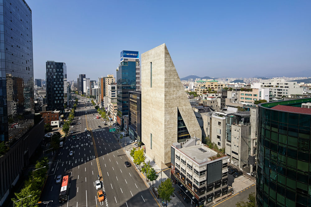 이처럼, 현대도시 서울의 강남도 국제주의 양식의 직육면체 유리 상자들이 도열하고 있는 획일화된 도시이며, 이 무표정한 강남의 대로변에서 송은은 단순한 볼륨의 독특하고 강력한 존재감을 지니고 서 있다. 중세 고딕 성당에서 추구하던 기념성이 하늘에 닻을 거는 수직적 건축 행위를 통해서 낮은 곳의 인간과 높은 하늘을 관계 지으려던 경건한 종교성의 표현이었다면, 여기서 드러나는 기념성은 경제적이고도 실용적인 세속적 전략의 산물이다. 삼각형의 첨두 볼륨은 이 지역 사선제한의 법규적 한계를 풀어내어 최대의 용적을 끌어내려는 경제성에서 비롯되지만, 결과적으로는 중세 도시 속에서 드러난 고딕 성당과 유사한 의고성을 지니며 뚜렷한 실용적 기념성으로 작동한다. 그리고 불투명한 정면 벽의 대칭성은 코어가 단면적으로 가장 높은 쪽에 위치해야 하는 기능적인 요청에 그대로 순응한 것이지만, 대부분 강남지역의 빌딩들이 각자 편한 대로의 입면을 표현하는 것에 반하여, 송은은 불투명(solid)하고 육중하게 도시에 박히고, 강한 대칭(symmetry)의 미학으로 정면을 구성하여 서울 강남이라는 현대도시 속에서 뚜렷한 존재감으로 드러난다.