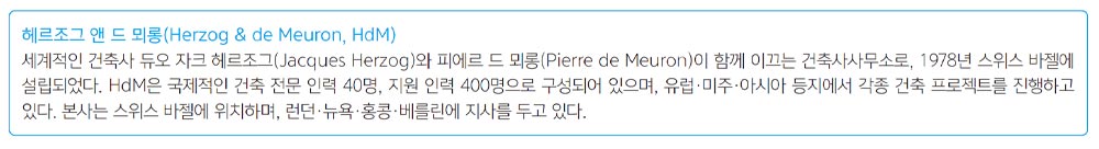 한 작업을 구체적으로 다루기 시작할 때, 설계 단계에서 그 작품에 대한 인식·이해가 달라집니다. 그렇기 때문에 HdM에서 내부적으로 조사를 먼저 진행하는데 사이트에 대한 데이터나 기능적인 법과 관련된 부분, 또는 건축물로서 도시계획의 일환으로만 보는 것뿐만 아니라 그 지역을 아우르는 마음, 심리에 대해서도 연구합니다.