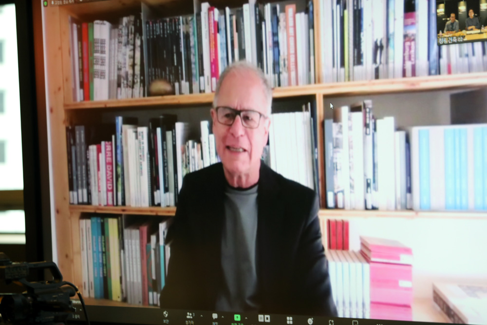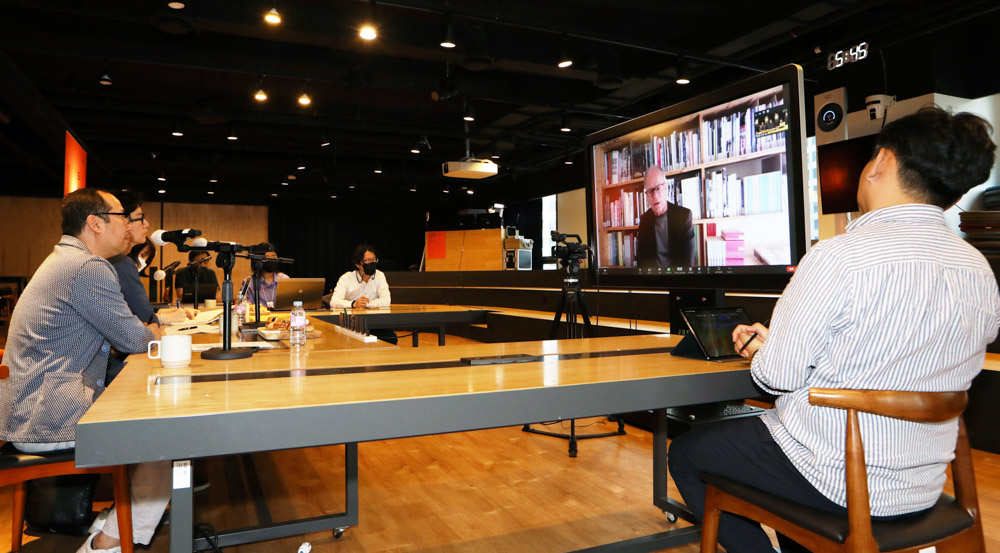 서울에서 피에르 드 뫼롱(Pierre de Meuron) 건축사를 기다리던 이은석 경희대 건축학부 교수와 기현철 정림건축 NID 본부장은 마침내 화면 속에 드 뫼롱 건축사가 나타나자 인사를 건넸다.