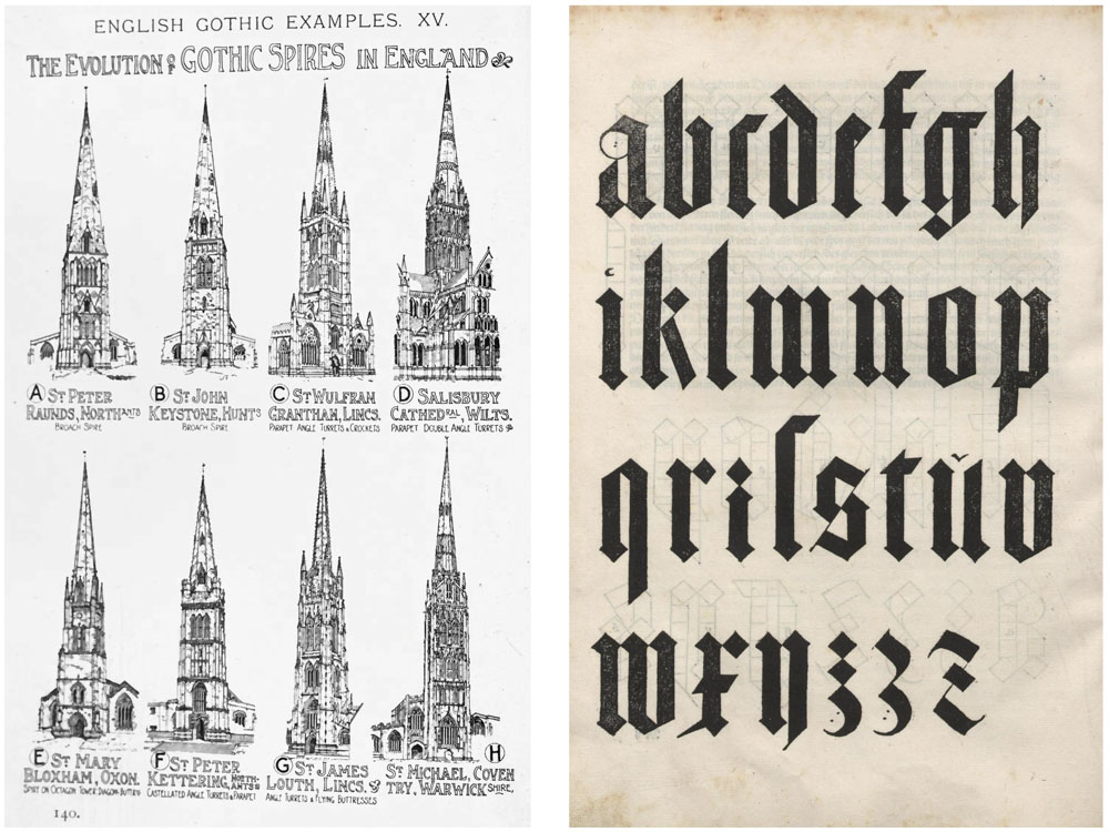 구텐베르크가 활자를 디자인할 때 기초로 삼은 중세 필사본의 글씨체는 중세 건축인 고딕 성당을 닮았다. 고딕 성당의 첨탑처럼 글자의 세로획 윗부분과 아랫부분이 뾰족하다.<사진 3> 건축은 언제나 그 시대의 문화 규범으로서 가구와 서체에까지 영향을 미친다. 고딕 가구 역시 고딕 성당을 축소한 것 같은 모양이다. 15세기 중반 구텐베르크가 발명한 인쇄술은 전 유럽으로 퍼졌다. 15세기는 르네상스 시대였고, 유럽 문화의 중심지는 이탈리아 북부 지역인 만큼 베네치아가 유럽 출판물의 50%를 생산할 정도로 인쇄 중심지가 된다. 당시 인쇄소를 운영하는 사람들은 사업가보다 인문학자가 많았다. 자존심이 강한 이탈리아의 인문학자들은 독일인이 디자인한 고딕체를 별로 좋아하지 않았다. 이는 그들이 고딕 건축을 좋아하지 않는 것과 같은 이유다.