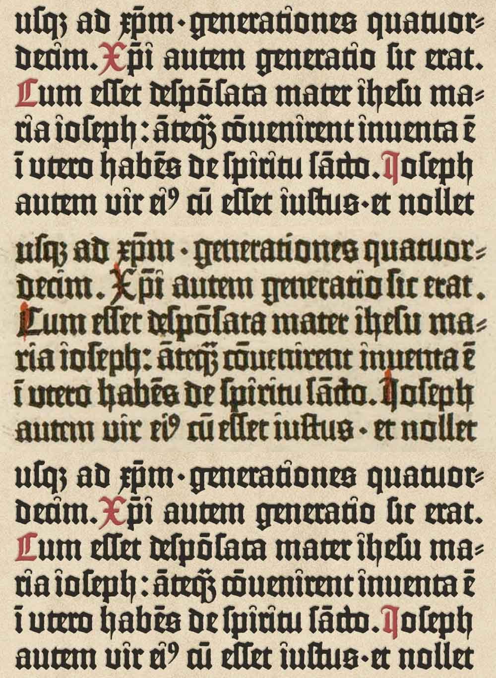 <사진 2> 구텐베르크가 디자인한 납활자의 모양은 중세 필사본에 쓰인 글자의 유형을 따 랐다. 나중에 이를 &lsquo;고딕체&rsquo;라고 이름 붙였다.