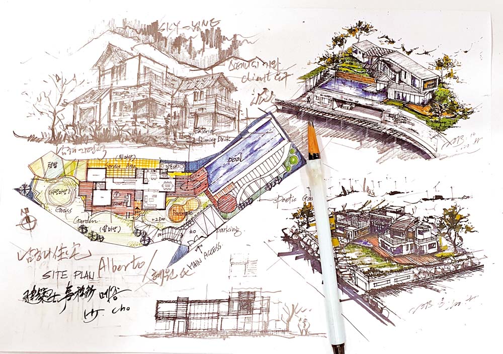 언젠가는 지인 한 분께서 디지털 시대에 허름한 내 연필 스케치 몇 점에 각별한 관심을 가지게 되었다는 외국인 건축주 한 분을 소개해 주었다. 남해 여자분과 결혼한 스페인 귀족 집안 출신의 젊은 이 양반은 아내의 고향에 부부의 한국 별장 겸 장모님을 위한 전원주택을 짓고자 했다. 몇 장의 스케치가 오고 가고 출국 전 흔쾌히 계약서에 도장을 찍어 주었다. 설계비는 한 푼도 깎지 않았으며, 몇 가지 요구사항 외의 모든 것은 건축사에게 맡겨 주었다. 이메일을 주고받으며 설계는 순조롭게 진행되었고, 집이 다 지어지던 날 난생처음으로 눈이 파란 친구에게 감사의 인사와 선물을 받기도 했다.