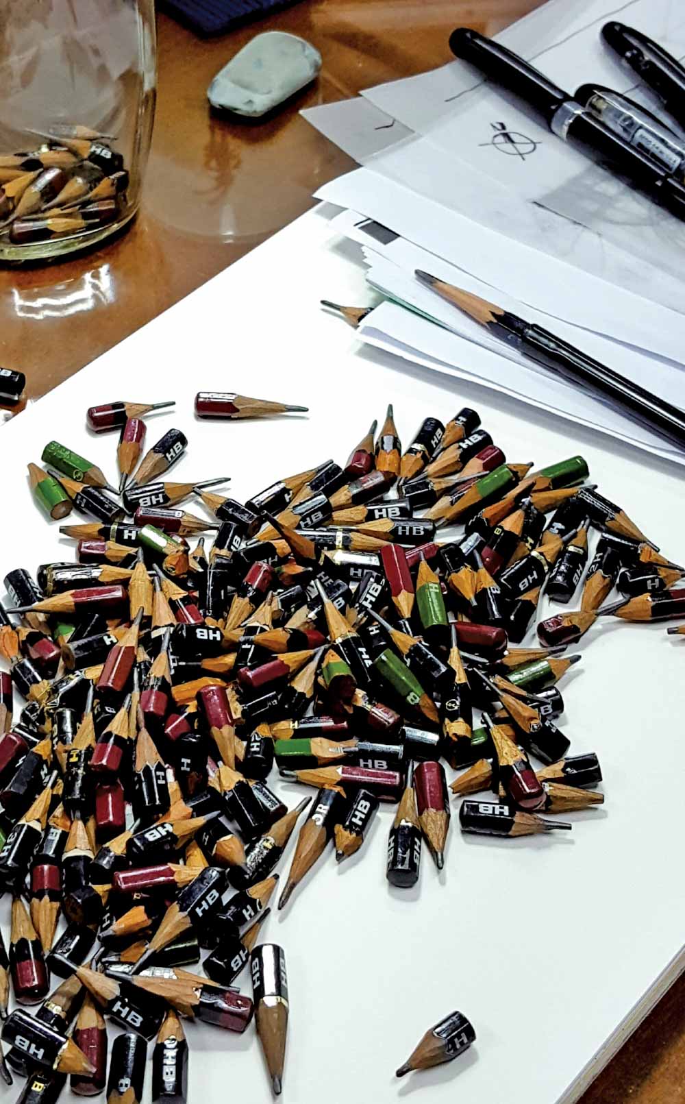 졸업하고 처음 입사한 사무실에선 모든 드로잉을 할 때 샤프가 아니라 반드시 연필을 쓰게 했다. 점점 짧아지면 볼펜대에 끼워 몽당연필이 될 때까지 쓰다가 검사받고 새 연필을 타 쓰고를 반복하던 어느 날, 벌꿀 유리병에 몽당연필이 반쯤 채워졌을 무렵 그 선배는 늦은 밤 포장마차에서 취한 목소리로 그 이유를 설명해 주셨다.