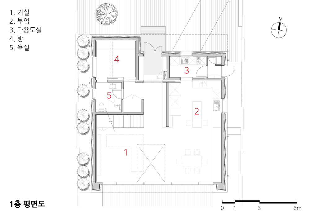 The site sits in a residential area in The County, Cheongna. It faces a 7-meter road to the north and nature to the south. It was designed to protect privacy from the road and embrace nature as much as possible to the south. Therefore, the north side came to have an entrance with eaves and minimum windows. The windows with various expressions were filled in the south by maximizing the legally available width.