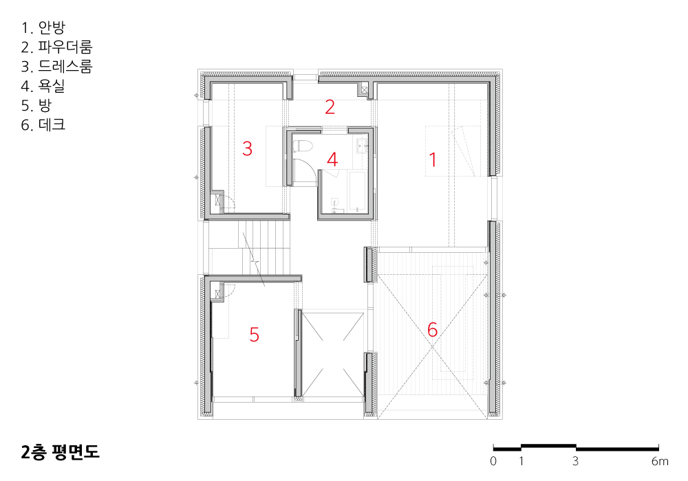 주택은 3개 층으로 구성된다. 지상층의 마당을 가지는 1층뿐 아니라 2~3층에서도 각각의 외부마당을 활용할 수 있도록 건물의 동측부분을 테라스 하우스 형태로 계획했다. 2층은 가벽과 함께 마스터룸을 위한 좀 더 내밀한 마당으로, 3층은 패밀리룸과 연계한 가족공간으로 활용된다.