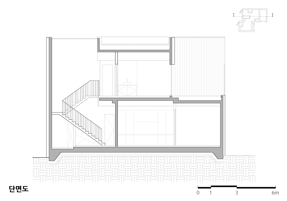 거실은 대지의 경사를 이용하여 1층의 다른 부분과 60센티미터 정도의 단차를 가지고 있다. 1층 주방과는 개방감을 유지하면서도 단차를 통해 어느 정도의 생활 영역의 분리를 유지하여 준다. 이는 업무공간이 작동하는 낮 시간 동안에도, 필요에 따라 가족생활의 공간이 유지될 수 있도록 계획되었다. 간혹 번잡해 질 수 있는 주방과 다이닝 공간에서 어느 정도 차분하게 유지될 수 있는 거실로 유지하고자 하였다.