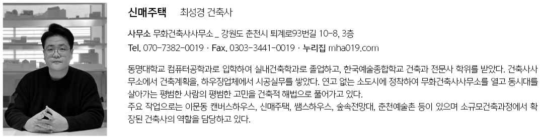 신매주택은 보통사람의 보통의 집이 되어야 했다. 그렇다면 ‘보통의 집’은 무엇일까? 보통의 집은 우리가 가져온 보편적 인식에 근거해야 했다. 남향에 환기가 잘 되고, 관리가 수월하고, 비가 새지 않고, 때로는 따뜻하거나 시원하며, 동선이 명쾌하고 친근한 공간구성을 갖는, 기성가구를 적절히 배치할 수 있는 집. 축약하면 지내면서 딱히 불편할 것 없는 집이었다.