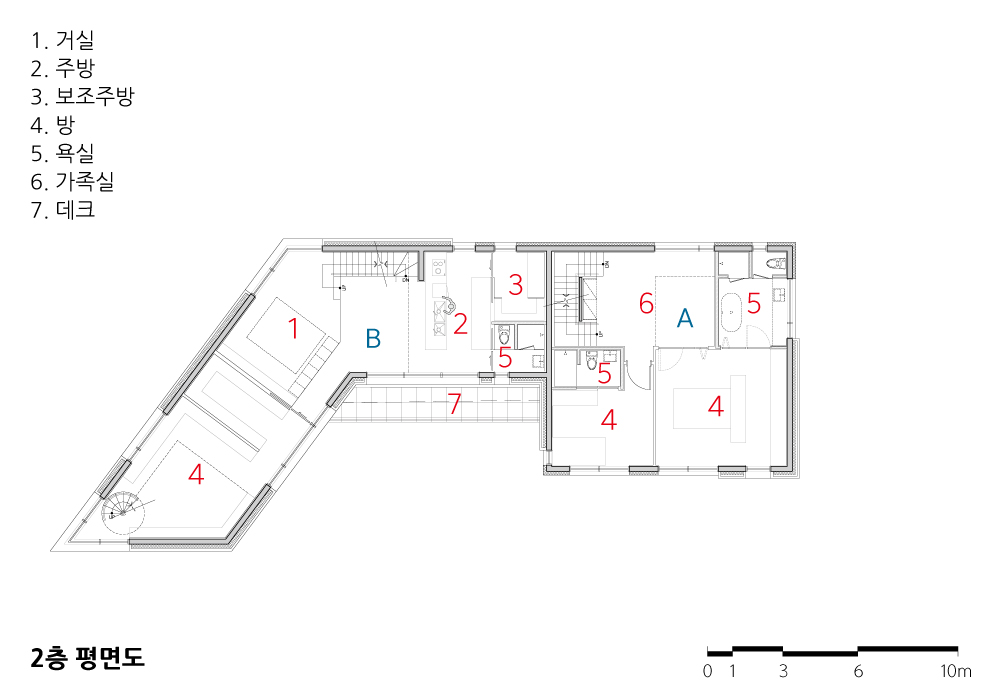생활패턴, 구성원, 가전, 가구, 살림살이 등 많은 부분이 다른 건축주 형제는 단순히 면적으로 서로의 영역을 정하기를 거부했다. 이에 숫자가 아닌 공간적으로 두 가구의 비례를 유지하려 노력하며, 서로 다르지만 각자의 장점을 가지는 거주환경을 제안했다.