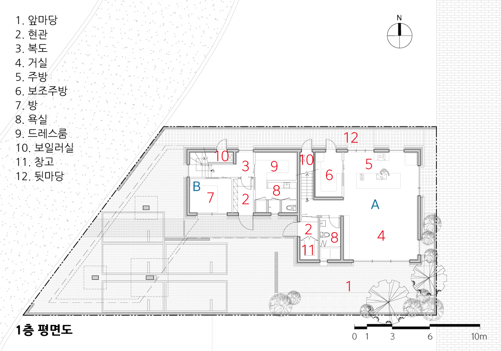 남북으로 좁고 동서로 긴 대지 형상에 따라서 자연스럽게 ‘동’과 ‘서’에 공간이 구성되었다. 조닝의 구성은 건축주 형이 어린아이가 있는 동생 가족을 위해 상대적으로 안락한 동측을 양보하면서 시작된다.