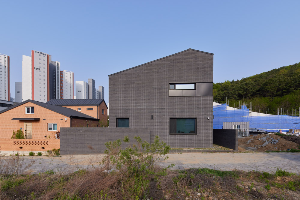 인근에서 가장 큰 필지인 대상부지는 규모나 위치적으로 주택단지의 중심적인 성격을 가진다. 무게감 있는 매스와 재료로 지역의 주요지가 되길 바랐다. 거기에 건축주가 추구하는 깔끔하고 정돈된 이미지를 구현하기 위해 최소한의 재료와 정리된 외장 색상을 적용하여 하나의 덩어리로 구현하고자 했다. 2가구가 사는 집이고 각자의 프라이버시를 지켜주기 위해 노력했지만, 형제는 한 가족에서 시작했고 지금도 깊은 유대감을 가진 모습을 투영하고자 했다.