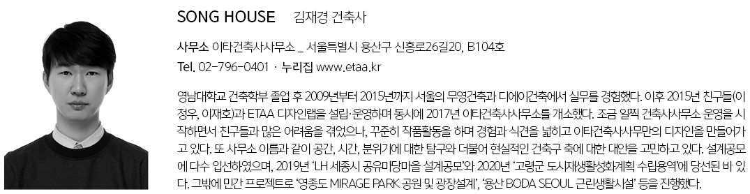 | SONG HOUSE 설계자 | 김재경_이타건축사사무소 건축주 | 개인 감리자 | 이타건축사사무소 시공사 | (주)공감건설 설계팀 | 이재호, 이정우 대지위치 | 경기도 화성시 동탄대로10길 45-10 주요용도 | 다가구주택 대지면적 | 410.50㎡ 건축면적 | 203.84㎡ 연면적 | 473.83㎡ 건폐율 | 49.66% 용적률 | 79.23% 규모 | 2층 구조 | 철근콘크리트구조 외부마감재 | 점토벽돌 내부마감재 | 수성페인트, 포세린타일, 합판마루 설계기간 | 2020. 09 - 2021. 05 공사기간 | 박종민 사진 | 전문기술협력 - 구조분야 : 시너지구조엔지니어링 - 기계설비분야 : (주)코담기술단 - 전기분야 : (주)코담기술단  |