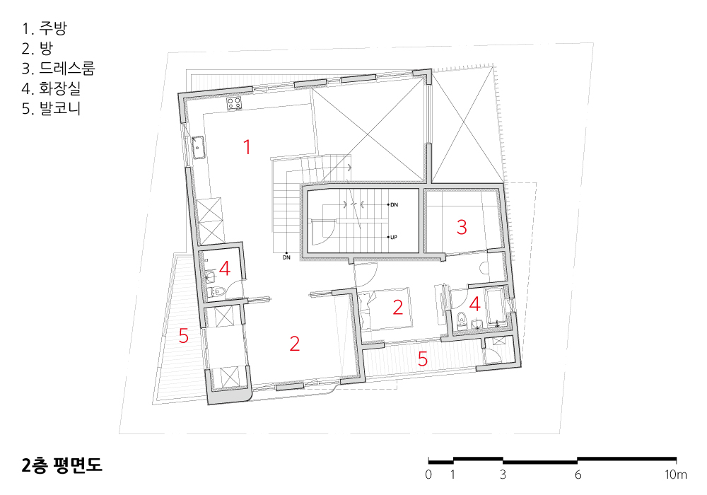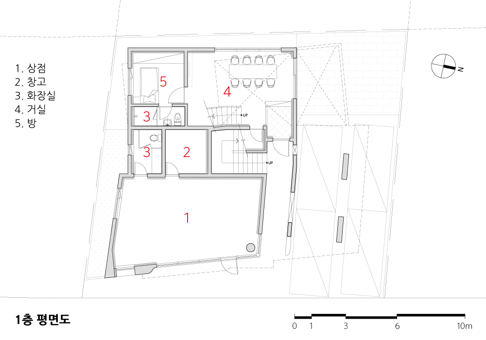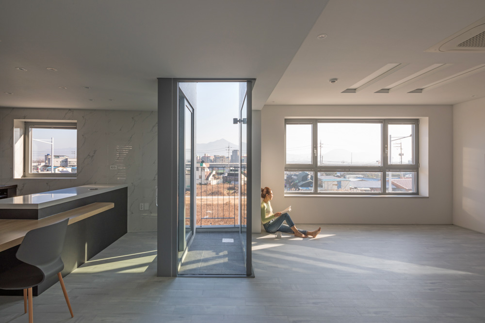상가주택을 짓게 되면 대부분 상가가 중심이 된다. 하지만 이 주택은 주거가 우선이 되는 작업이다. 엄마와 아들이 같이 살기 위해 두 가구의 주택을 만들고, 추가로 작은 공방을 개소하려는 시도이다. 현대는 가족관계에서 편리함과 개인의 점점 생활이 강조되는 시대이다. 집안에서 대화도 사라지고, 부모와 자식 간의 관계도 예전 같지 않다. 하지만, 부모와 자식 간 관심과 관계를 끊을 수도 없다. 그렇다고 단절되지도 않는다. 이러한 현실에 적합한 또 하나의 주거방식을 찾아보는 작업이다. 개인의 생활이 최대한 보장되고, 모자간에 멀리 있다는 불안감은 지울 수 있는 거주방식이 이 주택에서 시도된다.