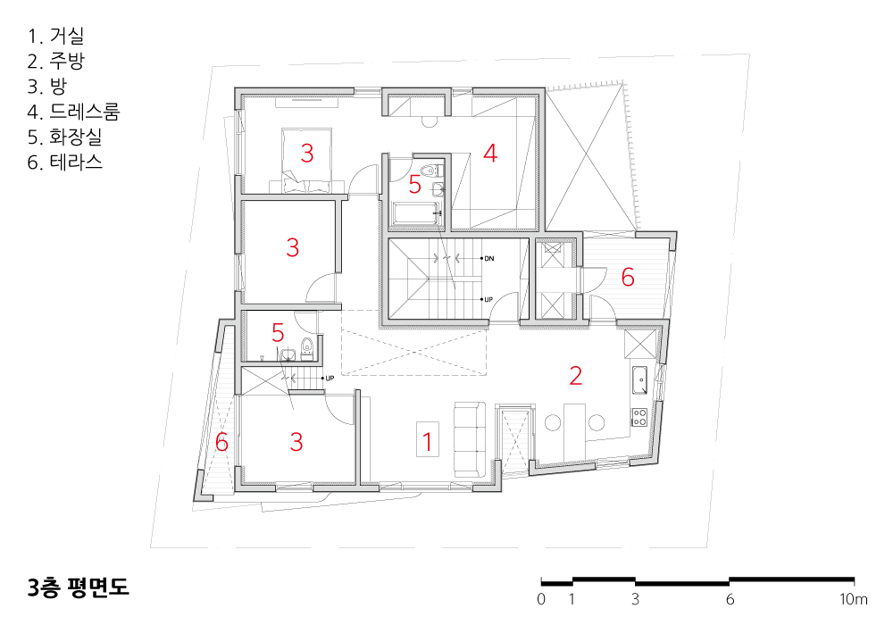 이 공간에서 엄마와 아들은 모자이크처럼 하나가 된다. 두 가구의 분리 생활과 관심 생활의 농도를 조절해서 구성하였지만, 1, 2층의 엄마 집과 3층과 다락의 아들 집은 1층에서 하나가 된다. 하지만 각각 출입하여, 그들의 생활은 따로 사는 듯하면서도 가까이 사는 모자간이 된다.
