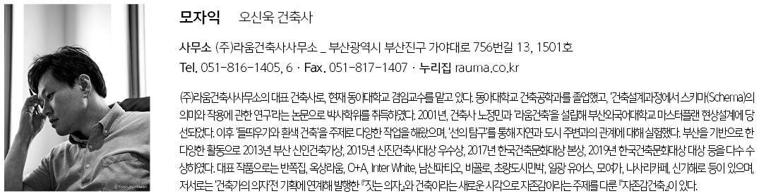 모자익 설계자 | 오신욱 _ (주)라움건축사사무소 건축주 | 이승준 감리자 | 오신욱 _ (주)라움건축사사무소 시공사 | (주)대정건설 설계팀 | 노정민, 안신, 유성철, 윤정옥, 최윤정, 김다영, 임아현 대지위치 | 부산광역시 강서구 명지국제12로 73 주요용도 | 단독주택(다가구주택), 제1종근린생활시설 대지면적 | 272.00㎡ 건축면적 | 159.23㎡ 연면적 | 379.00㎡ 건폐율 | 58.54% 용적률 | 139.34% 규모 | 3층 구조 | 철근콘크리트구조 외부마감재 | 모자이크타일(화이트), 노출콘크리트(유로폼), 알루미늄각재 루버 위 불소도장(화이트) 내부마감재 | 대리석타일, 강마루, 실크벽지 설계기간 | 2018. 10 – 2018. 12 공사기간 | 2019. 04 - 2019. 12 사진 | 윤준환 전문기술협력 - 구조분야 : 인구조 - 기계설비분야 : (주)신흥이앤지 - 전기분야 : 영신이앤지 |