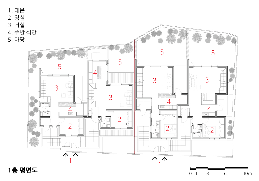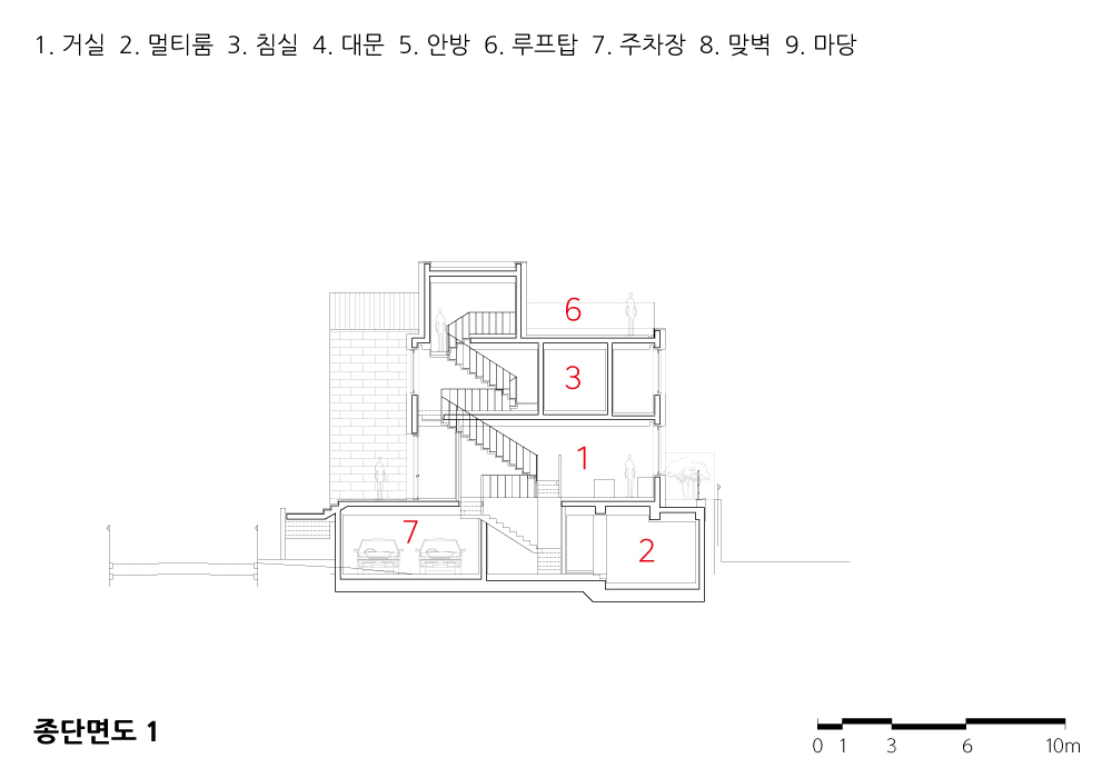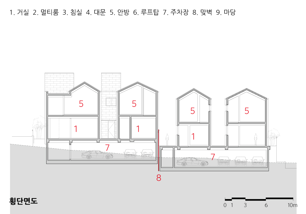 집의 구성은 간단하다. 레벨차를 이용한 주차장 진입과 지하에 위치한 간단한 멀티룸, 그리고 1층 거실 앞에 작지만 아담한 정원이 위치하고, 2층에는 침실들 그리고 동측 과학고를 바라볼 수 있는 루프탑이 이 집 프로그램의 전부이다. 세대가 공유하는 부분은 주차장과 기계실뿐이다.