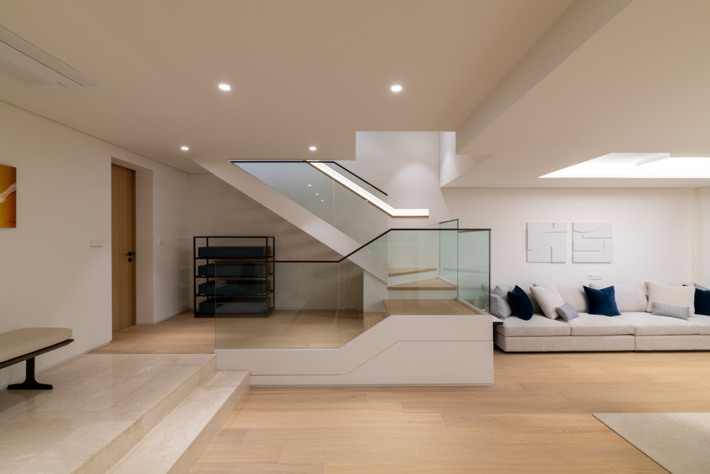I had to think a lot about how to connect and make the house vertical on a small piece of land, and in particular, for the stairs that have to move four floors to the roof, I had to consider efficiency and safety while narrowing the area. As a result, each floor has different stair systems, and the stairway is connected to the roof, leading to a rooftop garden with a view of the sky and a small natural garden on the first floor. The vertical connection rather than the horizontal connection of a multi-family house created diverse spaces, further increasing business feasibility.