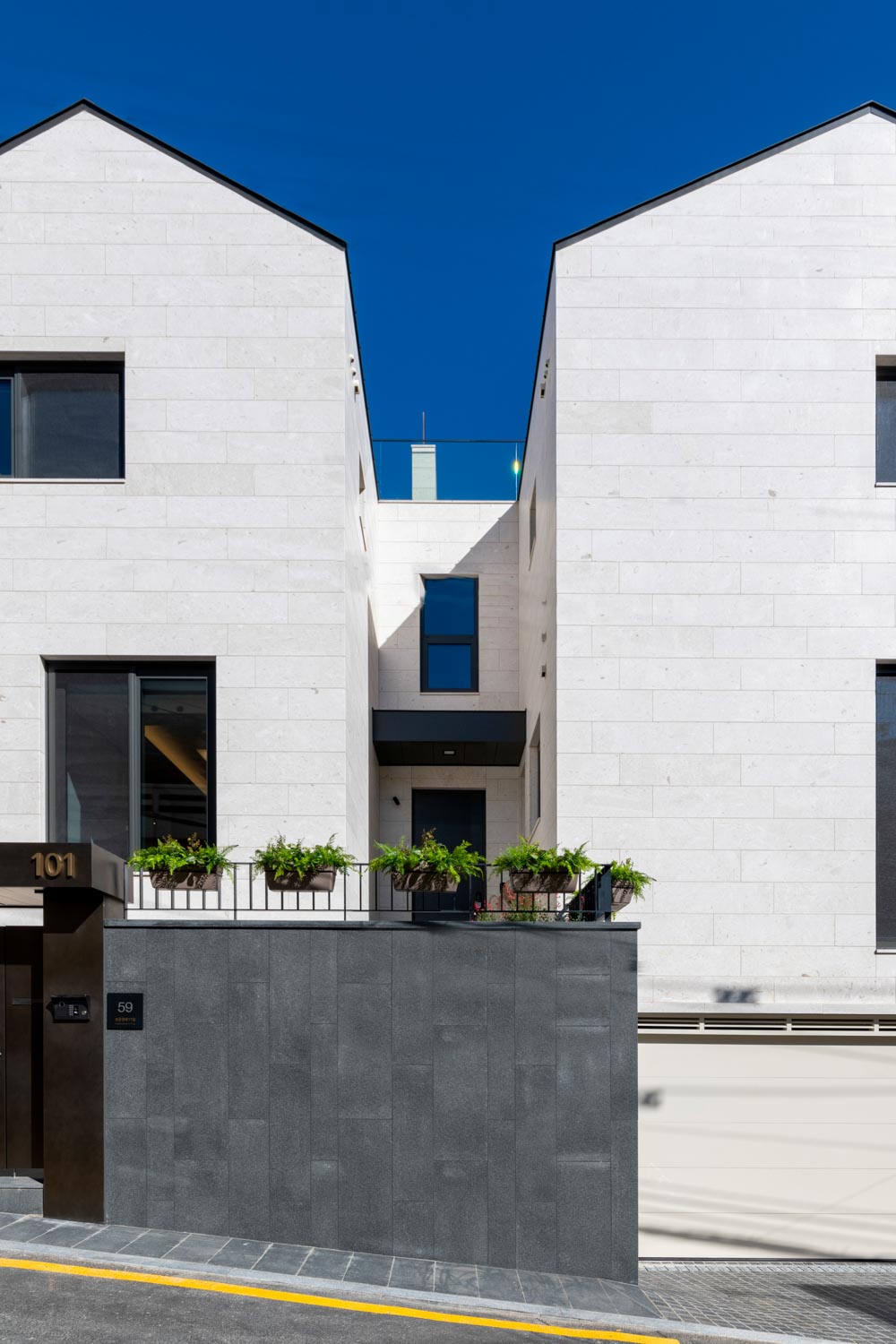 두 필지가 연접해 있는 부지는 사업성을 위해 각각의 필지에 3층의 다세대주택으로 설계 요청을 받았다. 오래전부터 집합주택의 연접에 대해서 고민해왔던 나는 수평의 세대분할보다는 수직의 세대분할을 제안했다. 건축법에서 허용해 준 맞벽이라는 제도를 이용, 세대 간 벽을 연접하여 4세대가 수직으로 연접되어 네 세대가 한 건물처럼 모여 사는 집합주택이 됐다.