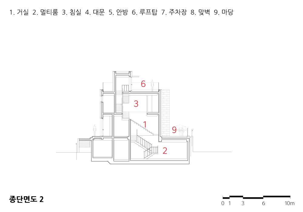 집의 구성은 간단하다. 레벨차를 이용한 주차장 진입과 지하에 위치한 간단한 멀티룸, 그리고 1층 거실 앞에 작지만 아담한 정원이 위치하고, 2층에는 침실들 그리고 동측 과학고를 바라볼 수 있는 루프탑이 이 집 프로그램의 전부이다. 세대가 공유하는 부분은 주차장과 기계실뿐이다.