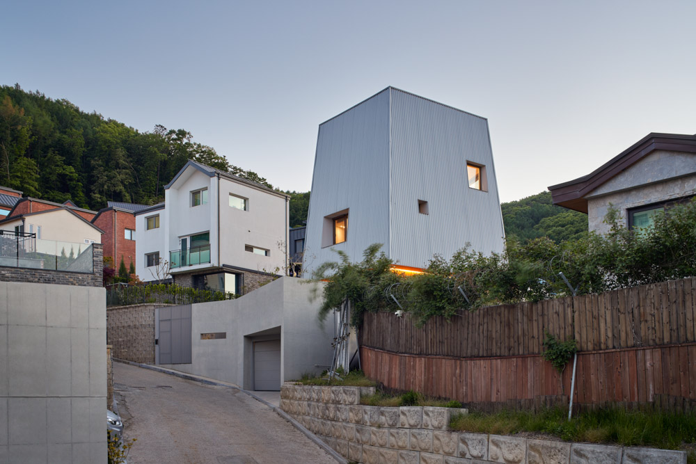 경사진 도로를 따라 펼쳐진 단독 주택들을 구경하며 올라가다 보면 길의 끝자락에 오묘한 형태를 가진 집이 나타난다. 지붕이 바닥까지 내려온 것 같아 보이기도 하는데, 주변 주택들이 백색의 외단열 시스템이나 벽돌 마감인 것과는 다르게 은색의 골강판이 집의 형태를 더욱 돋보이게 한다. 하부의 적삼목과 위로 갈수록 좁아지는 집의 형태는 마치 커다란 나무처럼 보이기도 한다. 부부와 고양이 두 마리 그리고 강아지 한 마리가 커다란 나무 그늘 아래에 산다. 집은 사는 사람을 닮는다고 하는데, 외관에서 풍기는 이미지부터 소박하지만 재밌는 것을 좋아하는 건축주 부부를 닮아있다.