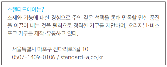 목재를 주요 소재로 한 생활가구를 주력으로 하는 스탠다드에이는 OEM 가구가 아닌 디자인부터 재료 선정과 가공(제작), 마감까지 전 과정을 담당하는, 오리지널 가구와 비스포크(맞춤) 가구를 취급하는 디자인스튜디오라고 할 수 있다. 제작자의 노력과 고민이 제품의 수명과 직결된다는 신념 아래 소재와 기능에 대한 그동안의 경험치를 바탕으로 정직함이 묻어나는 가구를 추구하는 이들. 현재는 파주에 제작소를, 서울 합정역 인근에 쇼룸을 두고 있으며 다양한 개인 또는 기업의 의뢰를 받아 작업을 해오고 있다. 지난 7월 8일, 스탠다드에이의 쇼룸에서 두 명의 실장을 만났다.