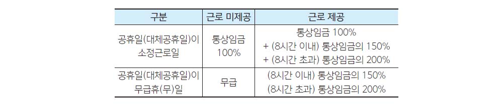 또한 일급제, 시급제 근로자가 공휴일 및 대체공휴일에 근로를 제공하는 경우, 월급제 근로자와 동일하게 휴일근로수당을 지급하면 된다.