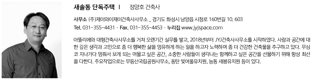 | 새솔동 단독주택Ⅰ 설계자 | 정양호_(주)제이와이제이건축사사무소 건축주 | 김현석 감리자 | 정양호 시공사 | 건축주 직영 설계의도 구현 | (주)제이와이제이건축사사무소 대지위치 | 경기도 화성시 큰나래2길 주요용도 | 단독주택 대지면적 | 311.00㎡ 건축면적 | 149.84㎡ 연면적 | 254.02㎡ 건폐율 | 48.18% 용적률 | 61.28% 규모 | 2F 구조 | 철근콘크리트구조 외부마감재 | 치장벽돌, 탄화목찬넬사이딩 내부마감재 | 수성페인트, 강마루 설계기간 | 2021. 07 - 2021. 09 공사기간 | 2021. 10 - 2022. 04 사진 | 천영택 전문기술협력 - 구조분야 : 광림구조엔지니어링 - 기계설비분야 : (주)익스플래니트 - 전기분야 : (주)익스플래니트 - 소방분야 : (주)익스플래니트 |
