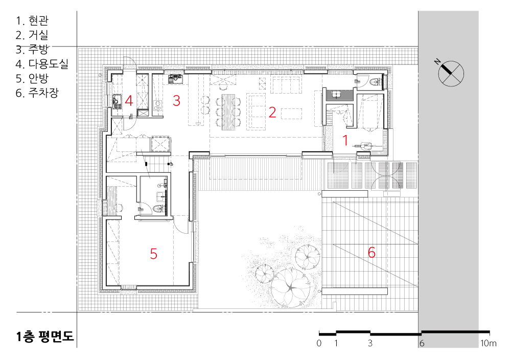 The area that can be directly constructed without a sub-contractor rather than using a constructor with a general construction license, tight construction cost (no client has spare money), four rooms (4 family members), a room at least 4.5 meters on one side (5-6 pyeong), and a parking lot that allows him to enter the house without being exposed to rain after parking, and a yard that gets plenty of sunlight but protects privacy. Other than that, he just said he left it up to us.