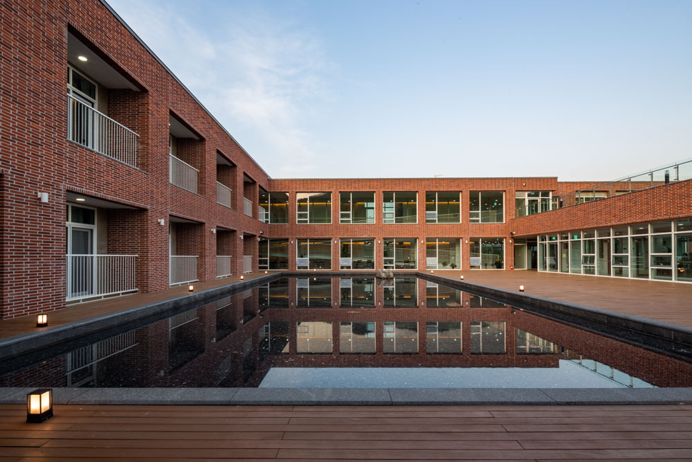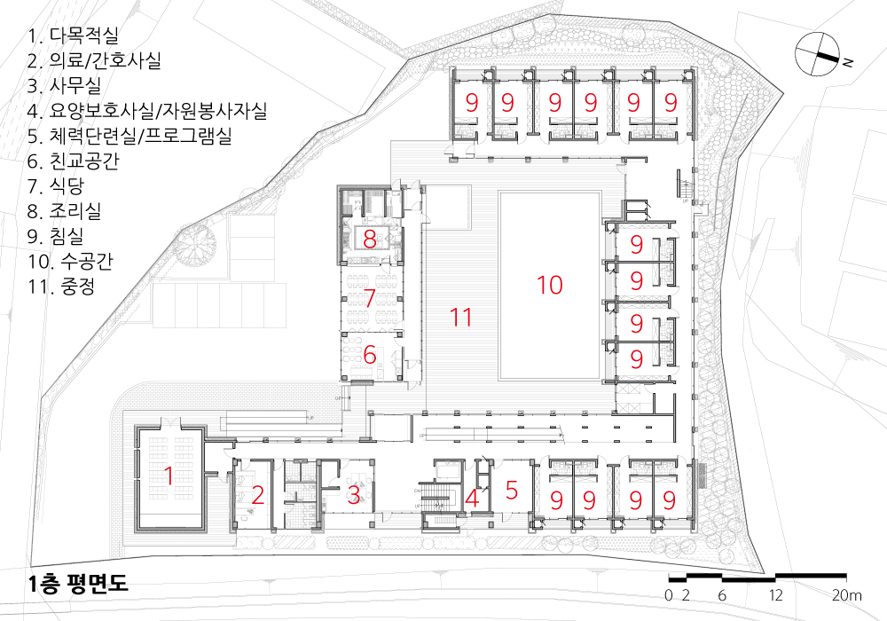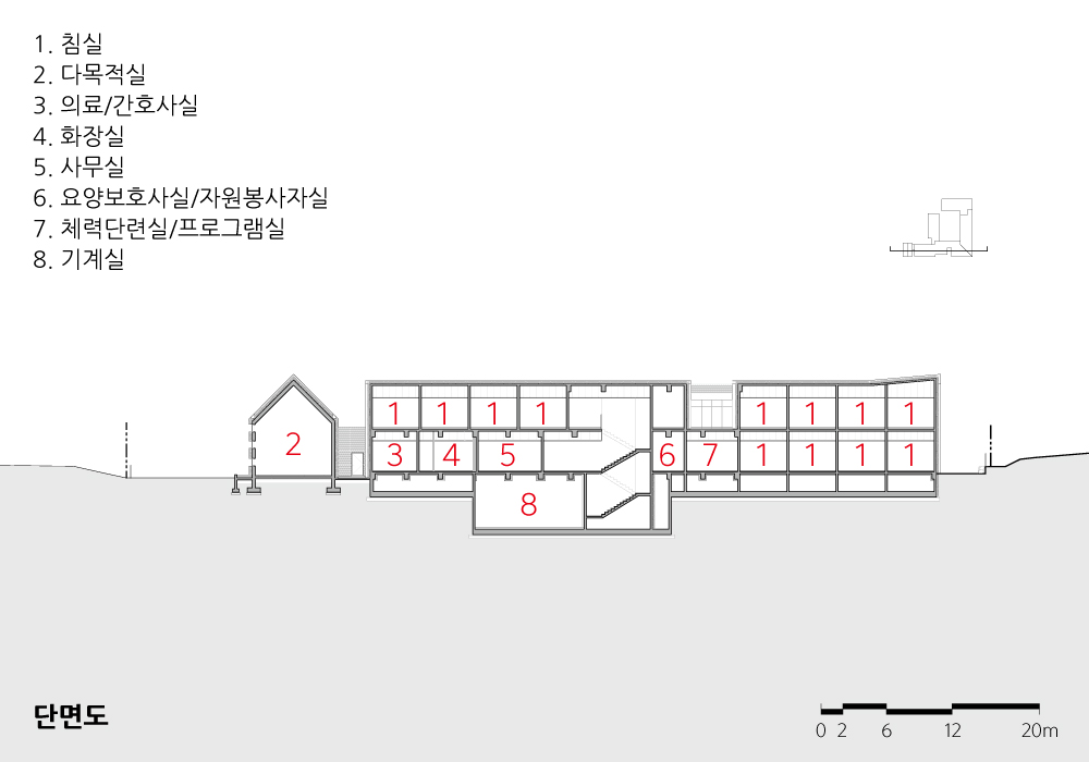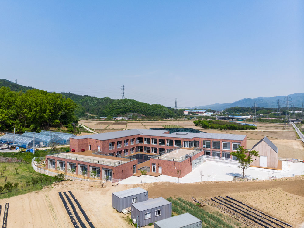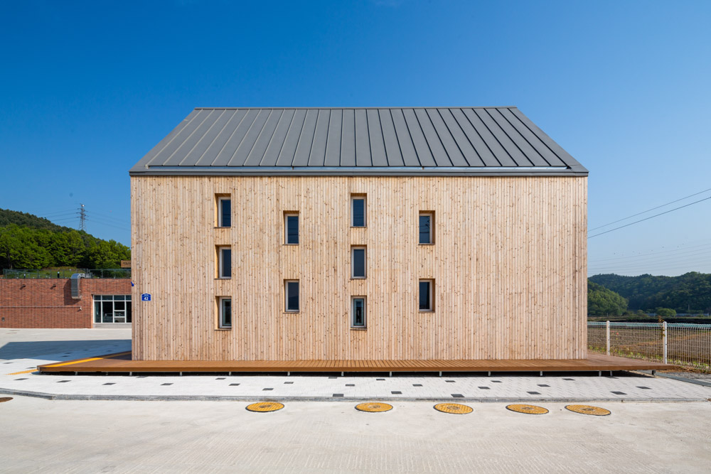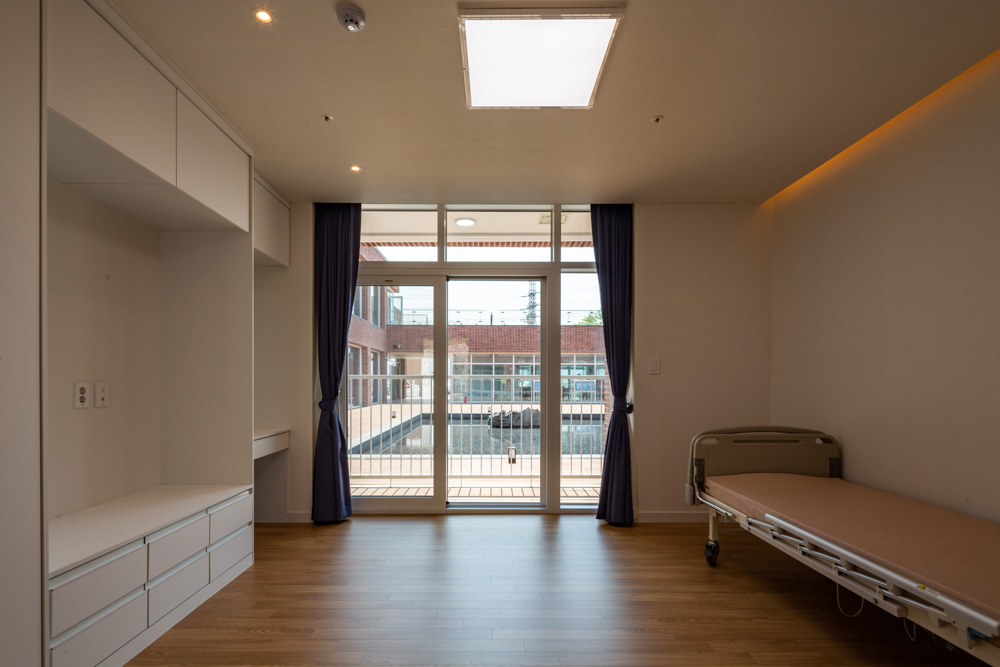 Sebit-Sisterhood Welfare Centre Architect | Choi, Dong-Kyu_Seoinn Design Group Client | Sebit-Sisterhood Corp. Supervisor | Choi, Dong-Kyu / Eun, Jae-Gook / Jeong, Dong-Jo Construction | Seongju Conctruction Project team | Jeong, Dong-jo / Lim, Eui-hyun / Kim, Pan-Seok Design intention realization | Seoinn Design Group Location | 42, Hwanghyoja-gil, Munmak-eup, Weonju, Gangwon-do, Korea Program | Welfare facilities for the Elderly Site area | 3,786.00㎡ Building area | 1,482.26㎡ Gross floor area | 1,991.80㎡ Building to land ratio | 39.15% Floor area ratio | 49.89% Building scope | B1F - 2F Structure | RC Exterior finishing | Redbricks, Exposed-Concrete, Western red Cedar, Low-E Double-Layered Glass Interior finishing | Tiles, Wooden Floor, Waterborne Paint Design period | Aug. 2019 - May 2020 Construction period | Aug. 2020 - Dec. 2021 Photograph | Lim, Jun-Young Electrical engineer | Daekyung Electrical Design Fire engineer | Daegeon Disaster Prevension Technology |