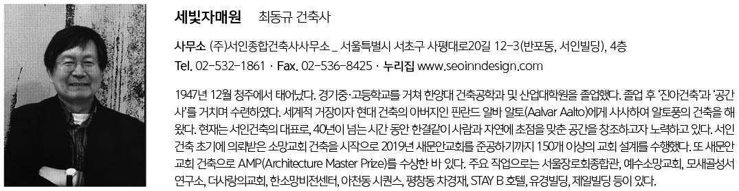 세빛자매원 설계자 | 최동규_(주)서인종합건축사사무소 건축주 | 사단법인 세빛자매회 감리자 | 최동규, 은재국, 정동조 시공사 | 성주건설(주) 설계팀 | 정동조, 임의현, 김판석 설계의도 구현 | (주)서인종합건축사사무소 대지위치 | 강원도 원주시 문막읍 황효자길 42 주요용도 | 노유자시설(노인복지시설) 대지면적 | 3,786.00㎡ 건축면적 | 1,482.26㎡ 연면적 | 1,991.80㎡ 건폐율 | 39.15% 용적률 | 49.89% 규모 | B1F - 2F 구조 | 철근콘크리트구조 외부마감재 | 적벽돌, 노출콘크리트, 적삼목, 로이복층유리 내부마감재 | 타일, 목재, 수성페인트 설계기간 | 2019. 08 - 2020. 05 공사기간 | 2020. 08 - 2021. 12 사진 | 임준영 전문기술협력 - 전기분야 : (주)대경전기설계사무소 - 소방분야 : 대건방재기술 |