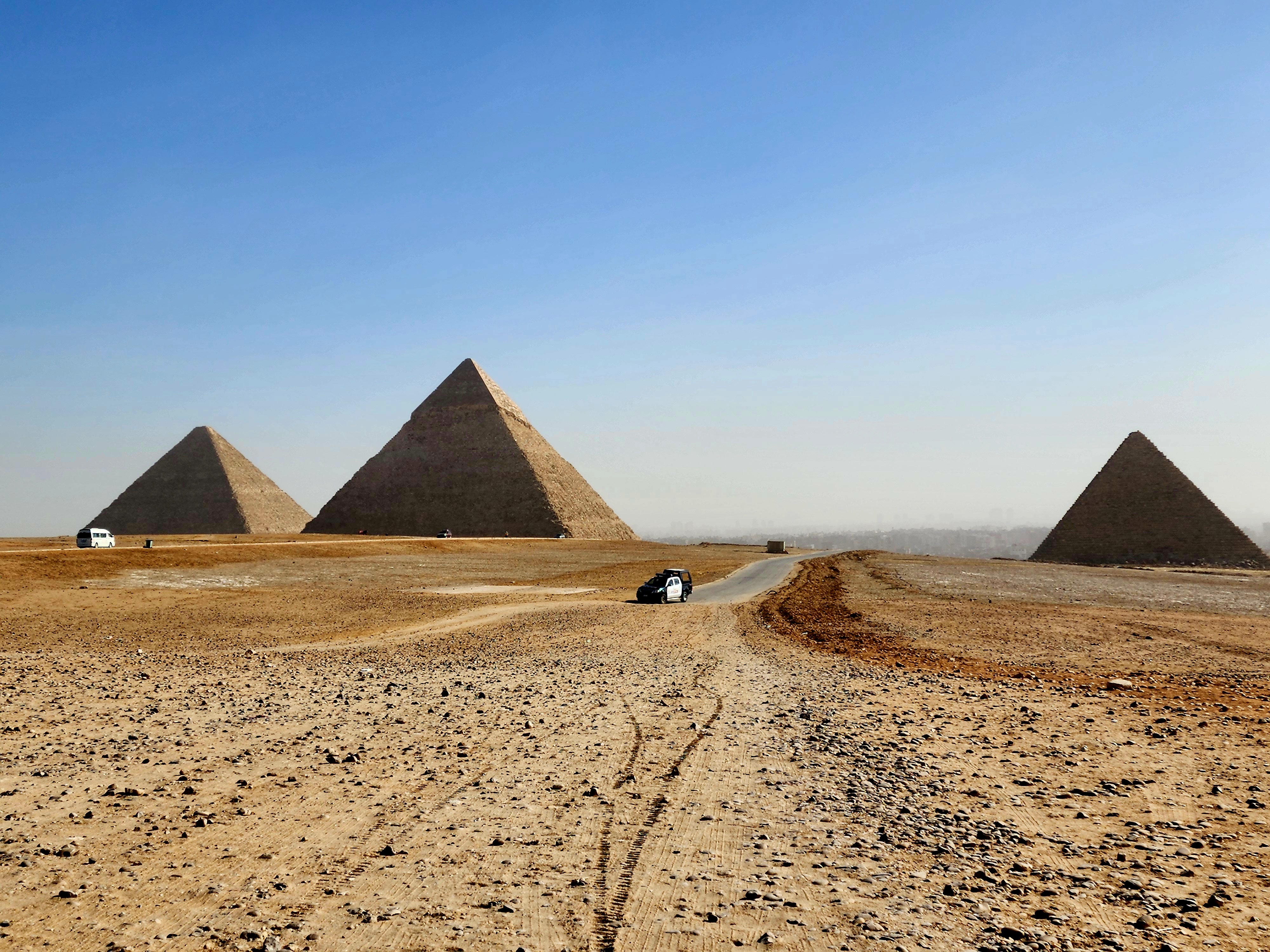 피라미드는 환생을 위한 ‘영혼의 집’으로 고대 이집트 왕(파라오)의 돌로 만든 무덤이다. 카이로 인근 기자 지역의 세 피라미드가 대표적인데, 왼쪽부터 쿠푸왕(147m), 카프레왕(143m), 멘카우레왕(65m)의 무덤이다. 4,500년 전에 만들어진 세계 최대의 무덤 앞에 서니 먼 과거로 돌아간 듯하다.