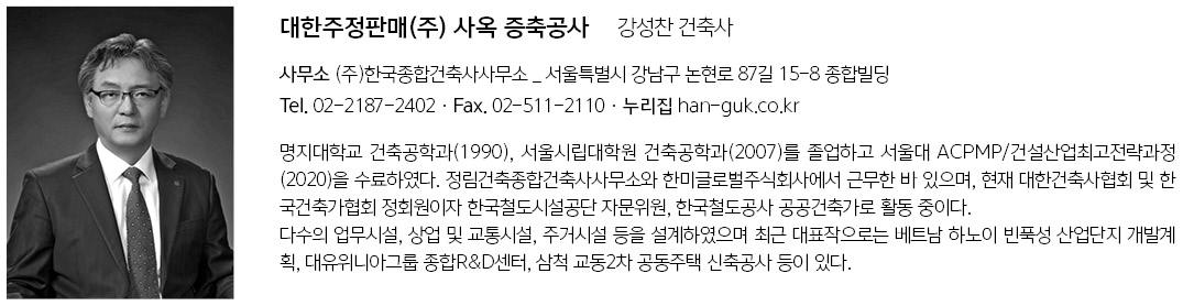 | 대한주정판매(주) 사옥 증축공사 설계자 | 강성찬 _ (주)한국종합건축사사무소 건축주 | 대한주정판매(주) 감리자 | 윤재일 _ (주)한국종합건축사사무소 시공사 | 박종웅 _ (주)삼일기업공사 설계팀 | 이규홍, 곽준걸, 유상규, 송용규 대지위치 | 서울특별시 금천구 시흥대로153길 16 주요용도 | 업무시설, 제2종 근린생활시설 대지면적 | 1,829.40㎡ 건축면적 | 915.13㎡ 연면적 | 5,516.13㎡ 건폐율 | 50.03% 용적률 | 183.28% 규모 | B2F - 7F 구조 | 철근콘크리트구조 외부마감재 | T5세라믹 복합판넬, T28로이복층유리(소프트코팅), T3알루미늄쉬트루버 내부마감재 | 바닥 _ T0.3 세라믹 코팅, T12 접합타일, T12 포셀린타일 벽체 _ 수성페인트, T9 포셀린타일, T9 자기질타일 천장 _ T9.5 석고텍스, PVC계 천정재, 마이톤 설계기간 | 2018. 09 - 2019. 03 공사기간 | 2019. 04 - 2020. 06 구조분야 | (주)에이치구조 엔지니어링 기계설비·소방분야 | (주)성우엠이씨 전기분야 | (주)진원엔지니어링 |