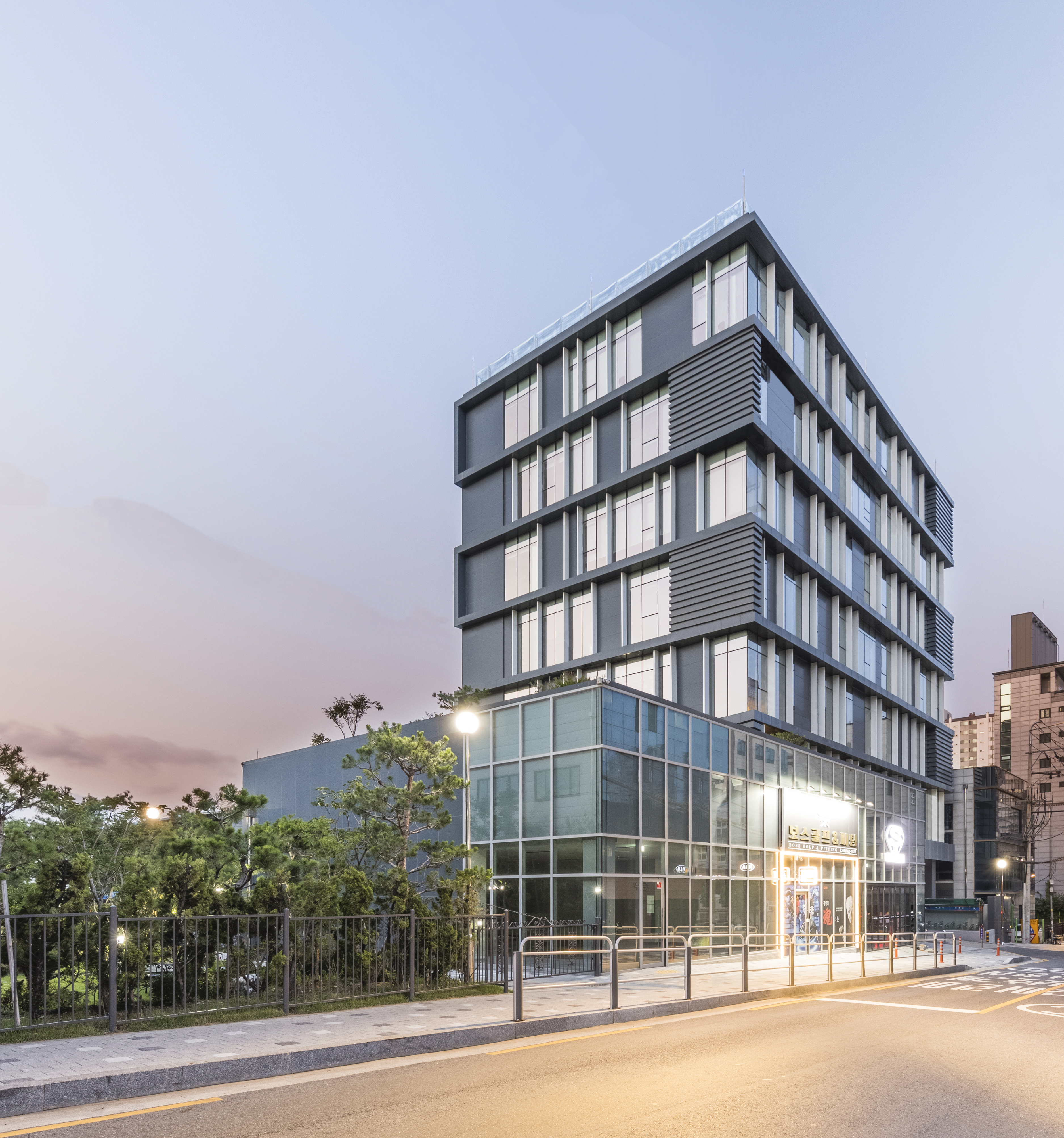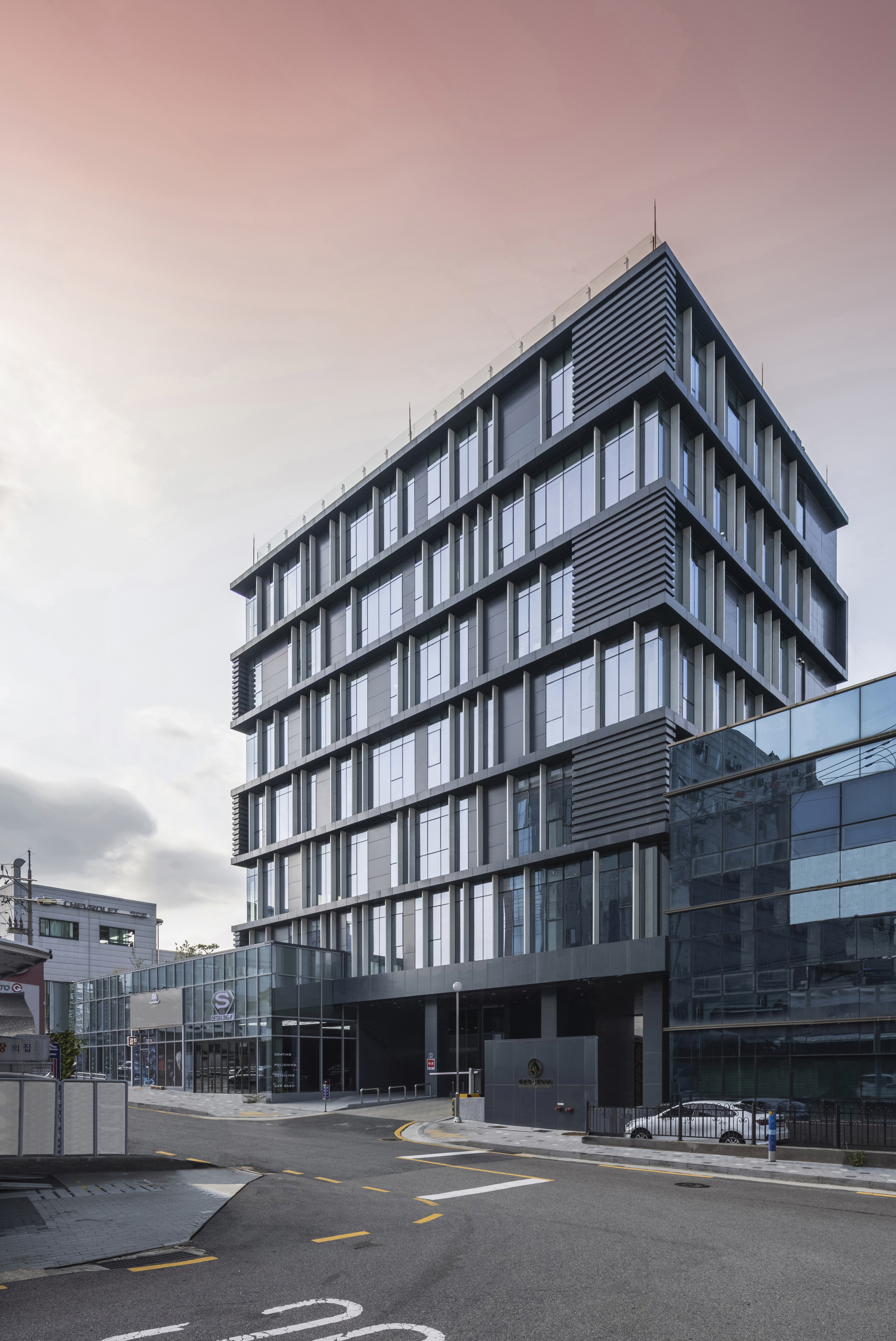 우뚝 선 주 매스는 도시의 단정함과 세련됨을 단아하게 패턴화하고, 저층부 분리공간은 상업공간의 우아함을 표현하기 위해 유리와 프레임을 텍스처로 반영하여 탈 산업단지, 탈 공장을 목표로 계획하였다.