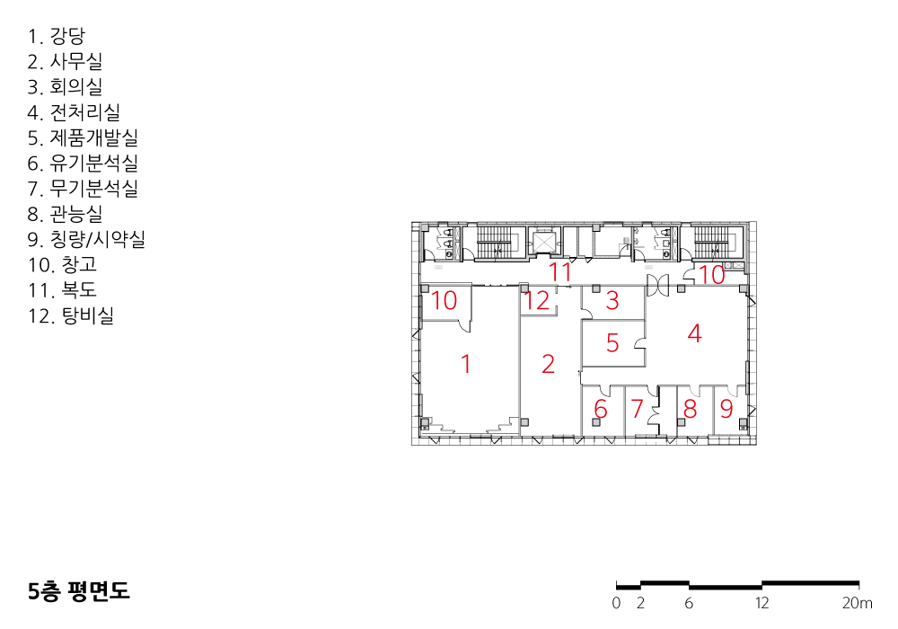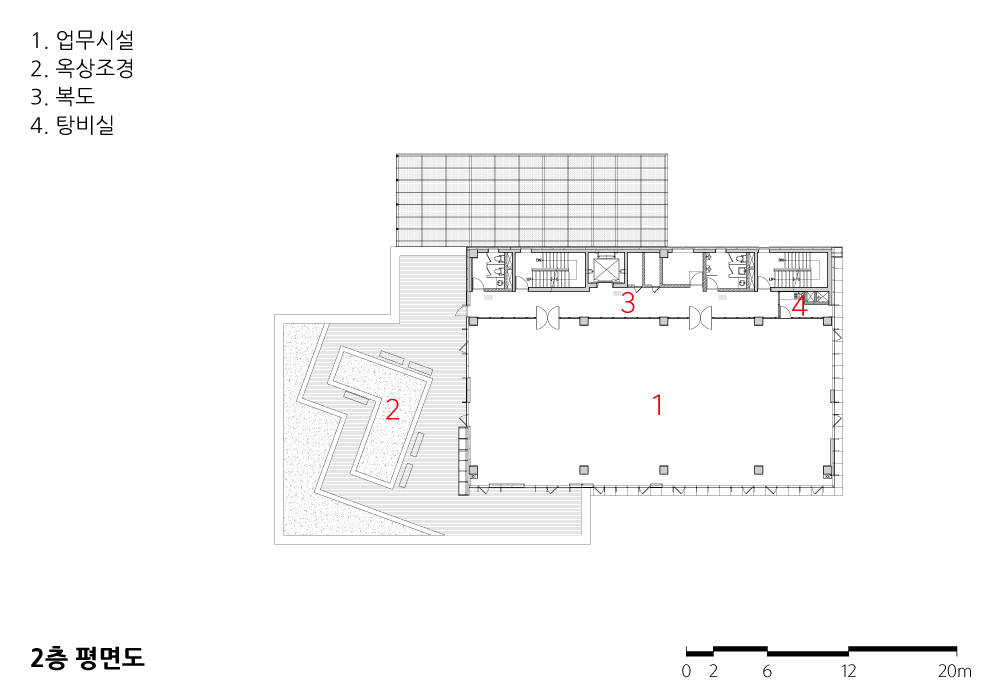 The functions of exhibition, workplace and rest spaces are divided separately and placed onto upper masses, and main entrance spaces are composed of lower masses in consideration of accessibility and convenience. The outdoor (landscape) space is a transitional space between the indoor and outdoor spaces, leading to efficient use of land and space.