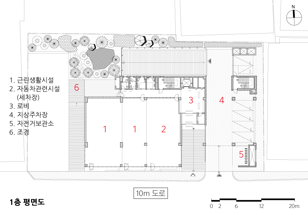The functions of exhibition, workplace and rest spaces are divided separately and placed onto upper masses, and main entrance spaces are composed of lower masses in consideration of accessibility and convenience. The outdoor (landscape) space is a transitional space between the indoor and outdoor spaces, leading to efficient use of land and space.