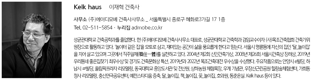 Kelk haus Architect | Yi, Jaehyuk _ Admobe Architect Construction | Supia Construction Project team | Lim Donghyun, Song Siyeol, Kang Hyunbo Location | Shindang-dong, Jung-gu, Seoul, Korea Program | Detatched house + Neighborhood facilities Site area | 80.07㎡ Building area | 45.24㎡ Gross floor area | 119.92㎡ Building to land ratio | 56.50% Floor area ratio | 148.76% Building scope | 3F Structure | Light-frame wood structure Exterior finishing | Wall _ STO(EIFS) / Roof _ Steel sheet Interior finishing | Wood flooring, Wall paper, Laminated wood Design period | Jan. 2020 - Sep. 2020 Construction period | Mar. 2021 - Sep. 2021 Photograph | Kim, Changmook Structural engineer | Ma, Youngmin Mechanical engineer | Kim, Kipyo Electrical engineer | Kim, Kipyo / Kim, Sungryul |